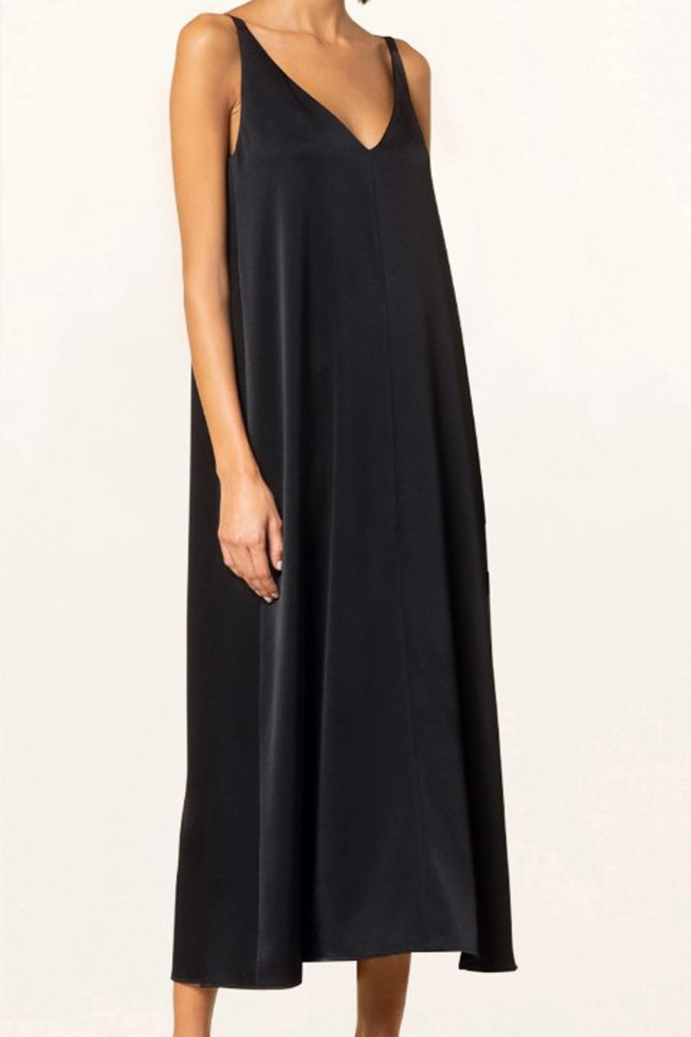 Type-Abundant Black Dress, Color-Black, Neck type-Deep V neck, Sleeve Length-Sleeveless, Fit-Relaxed, Fabric-Satin Lycra
