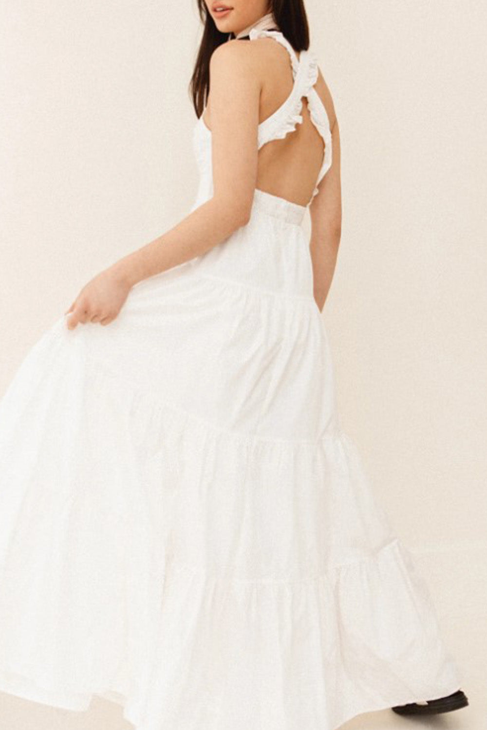 Type-Adorned White Dress, Color-White, Neck type-V Neckline, Sleeve Length-Sleeveless, Fit-Regular, Fabric-Poplin