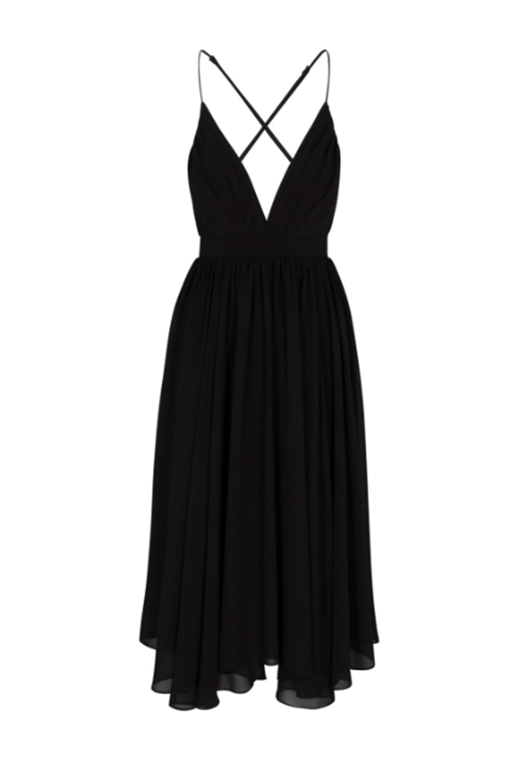 Crafted from high-quality georgette fabric, the dress drapes gracefully, providing a luxurious feel against your skin. The fit-and-flare silhouette accentuates your curves while offering a comfortable and figure-flattering fit. The deep black hue enhances the dress's timeless appeal, ensuring it remains a staple piece in your wardrobe for years to come.