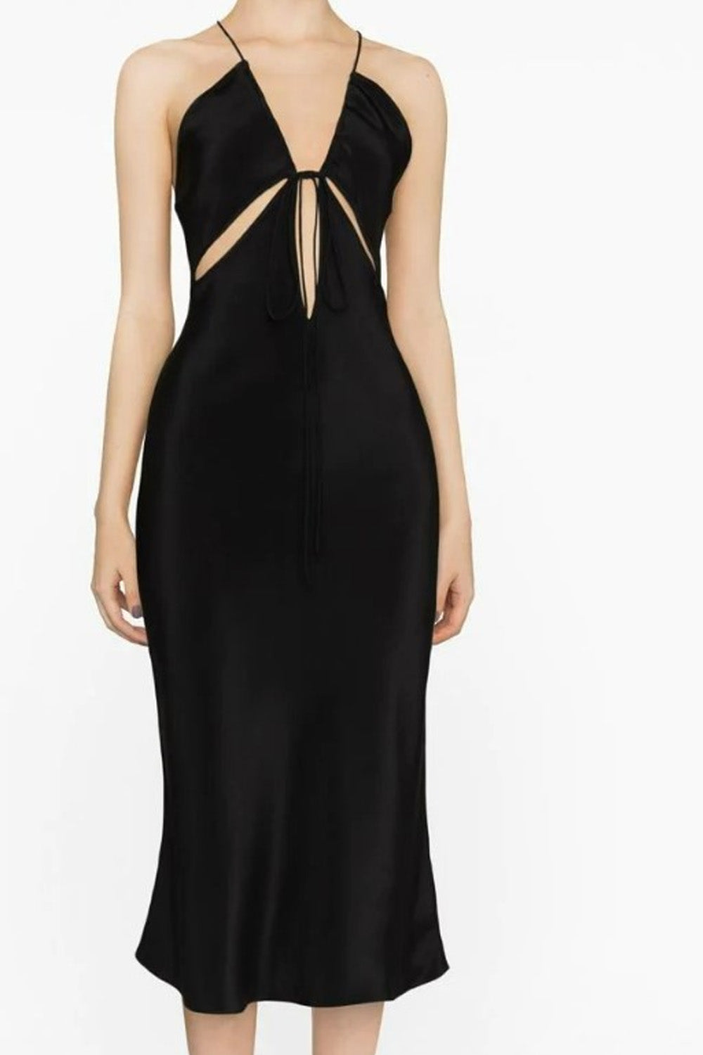 Type-Aphrodite Black Dress, Color-Black, Neck type-V neck, Sleeve Length-Sleeveless, Fit-Body Fit, Fabric-Satin