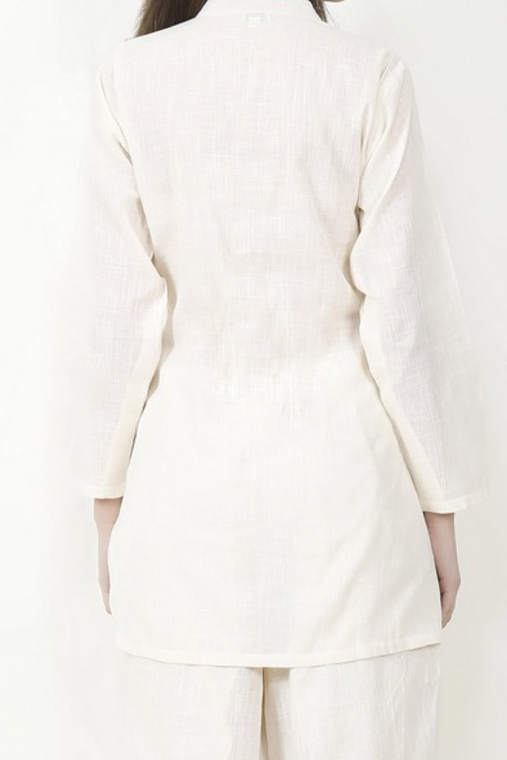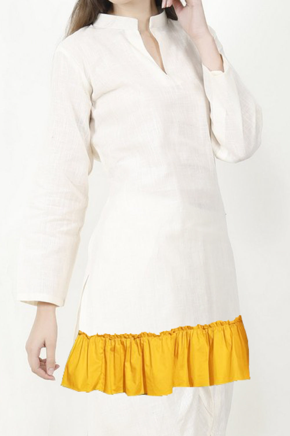 White ethnic top | Full sleeve | Ocre ruffles at hem