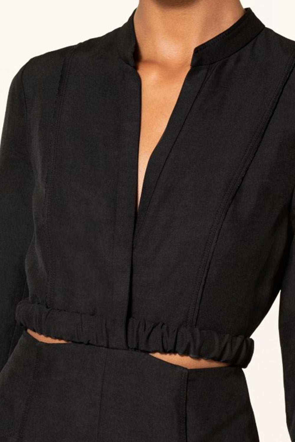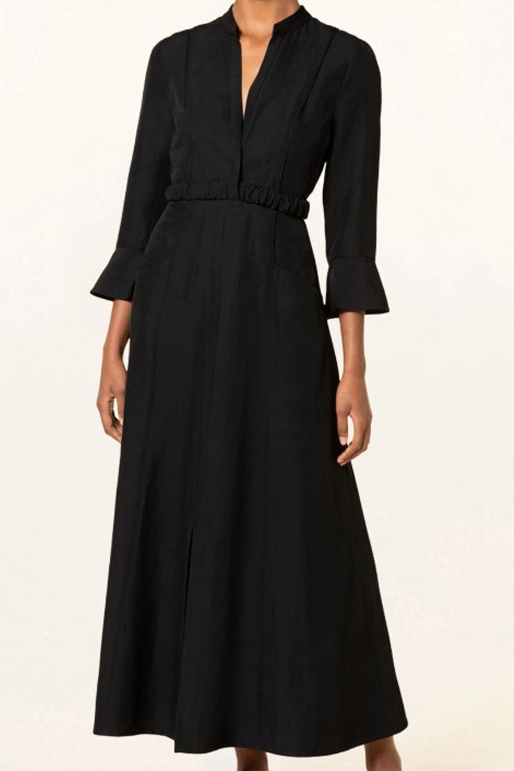 Type-Backwoods Black Dress, Color-Black, Neck type-Slit neck with stand-up collar, Sleeve Length-Below elbow length, Fit-Regular, Fabric-Cotton
