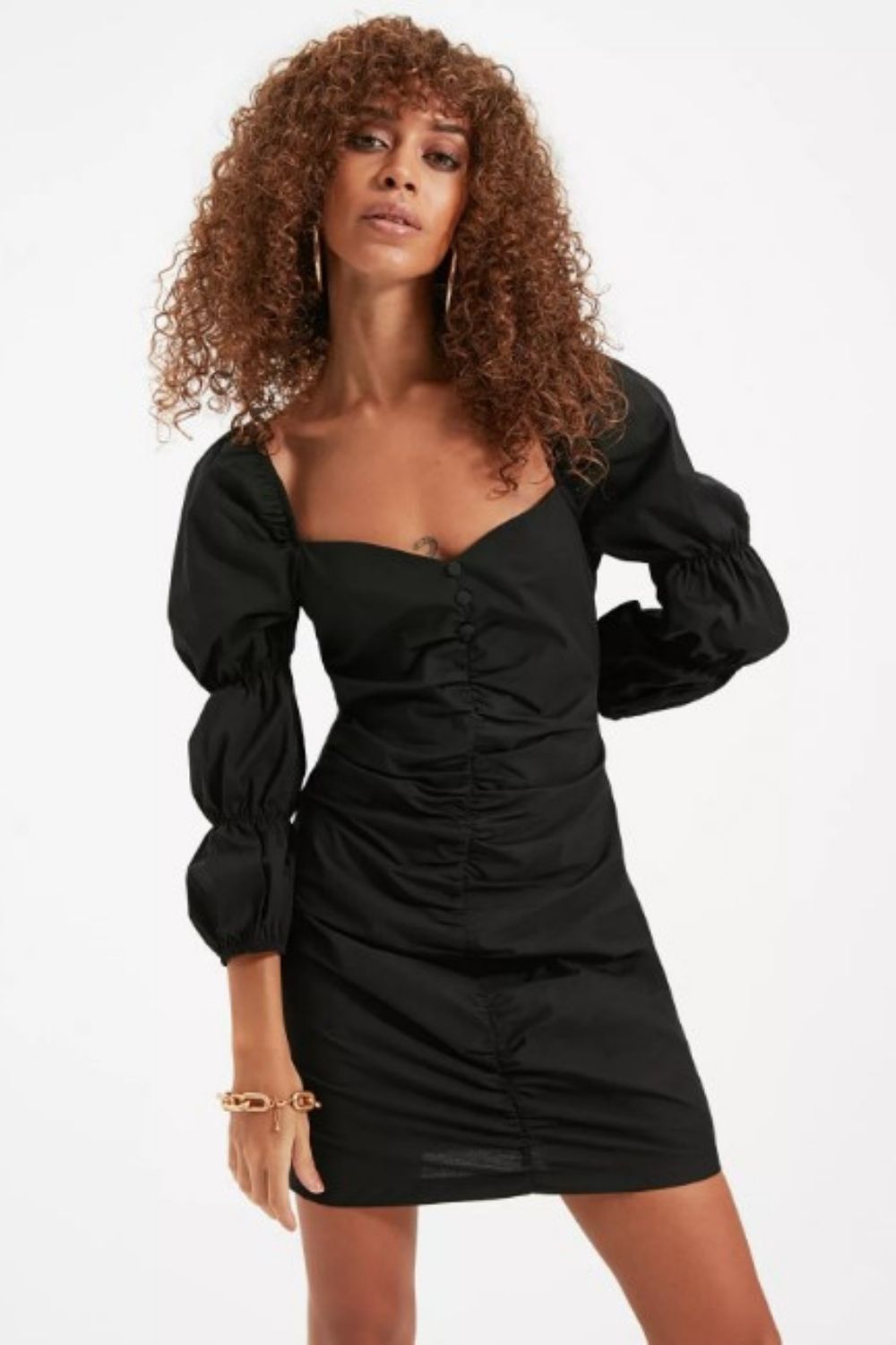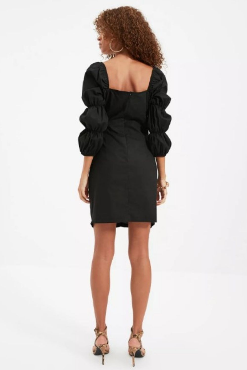 The three-fourth length balloon sleeves add a playful yet elegant flair, making this dress a standout piece for any occasion. The classic black color exudes timeless appeal, providing endless styling possibilities. Whether you're heading to a brunch, a cocktail party, or a special date night, this dress effortlessly takes you from casual to chic with ease.