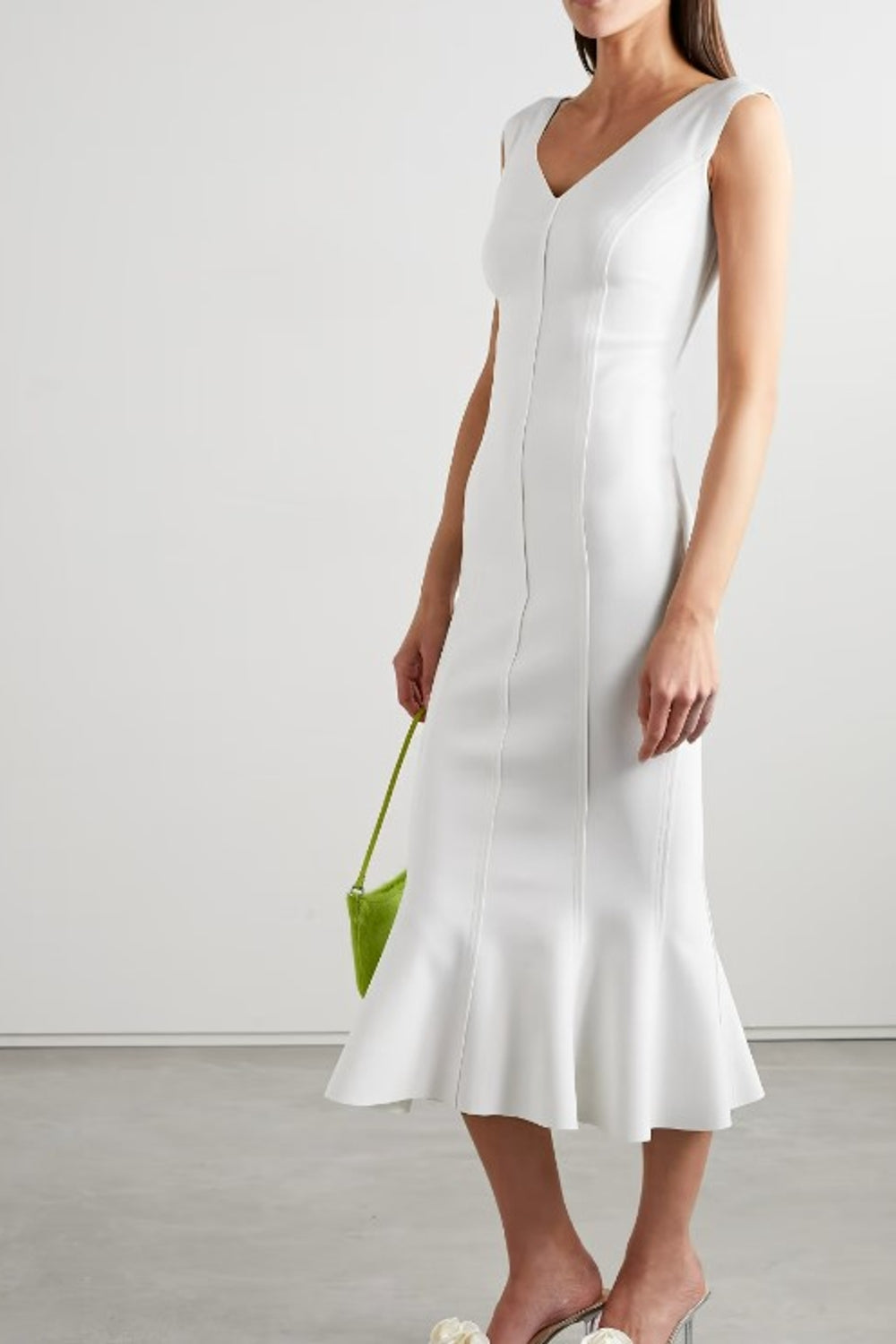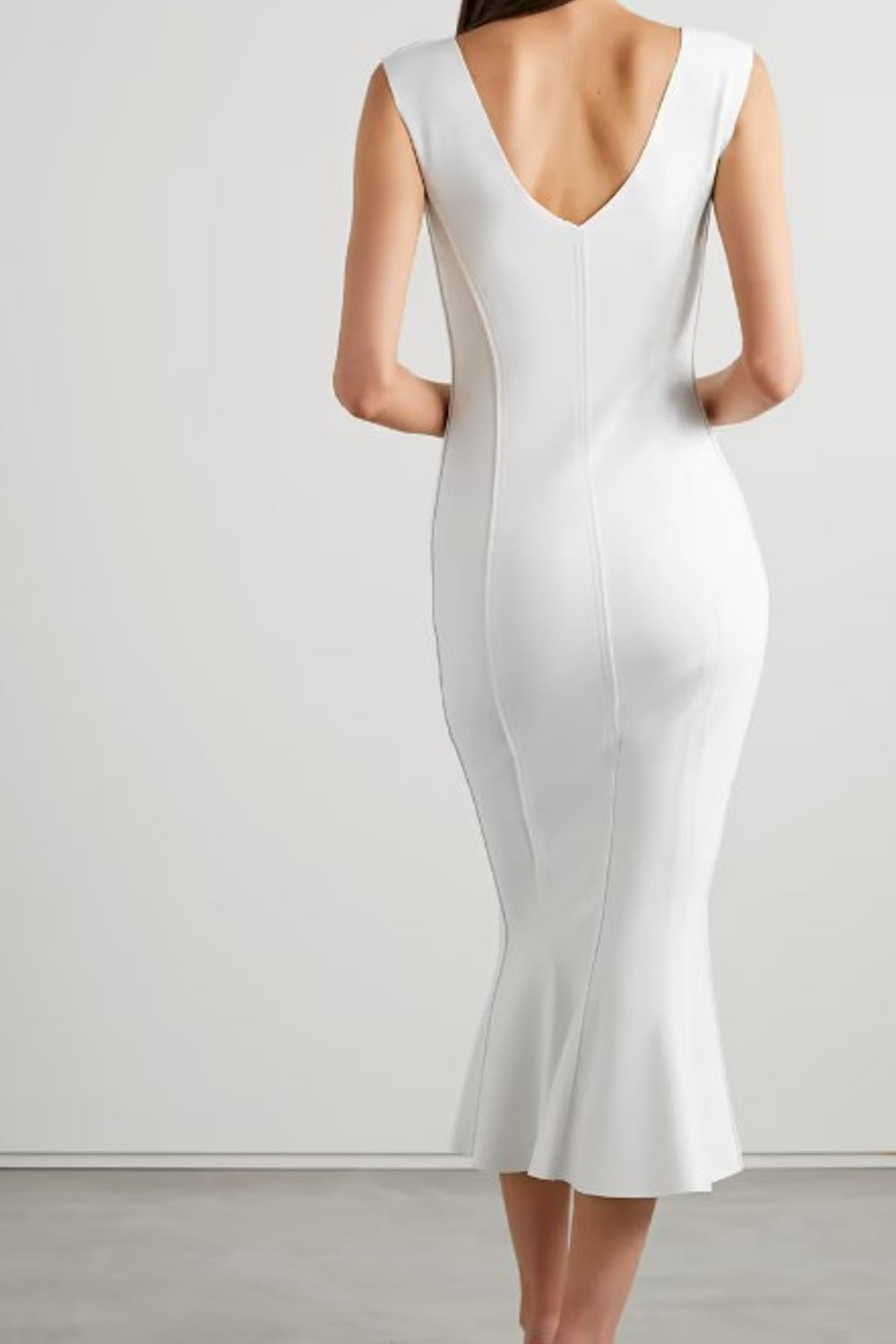 Type-Berezniki White Dress, Color-White, Neck type-V Neck, Sleeve Length-Sleeveless, Fit-Body Fit, Fabric-Poly Lycra