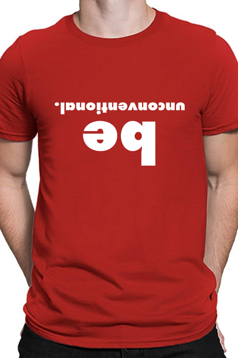 Quite a head turner! Be Unconventional - For those who do not follow norms. The graphic is printed on a red T-Shirt. Sizes - Small - 36in, Medium - 38in, Large - 40in, XL - 42in