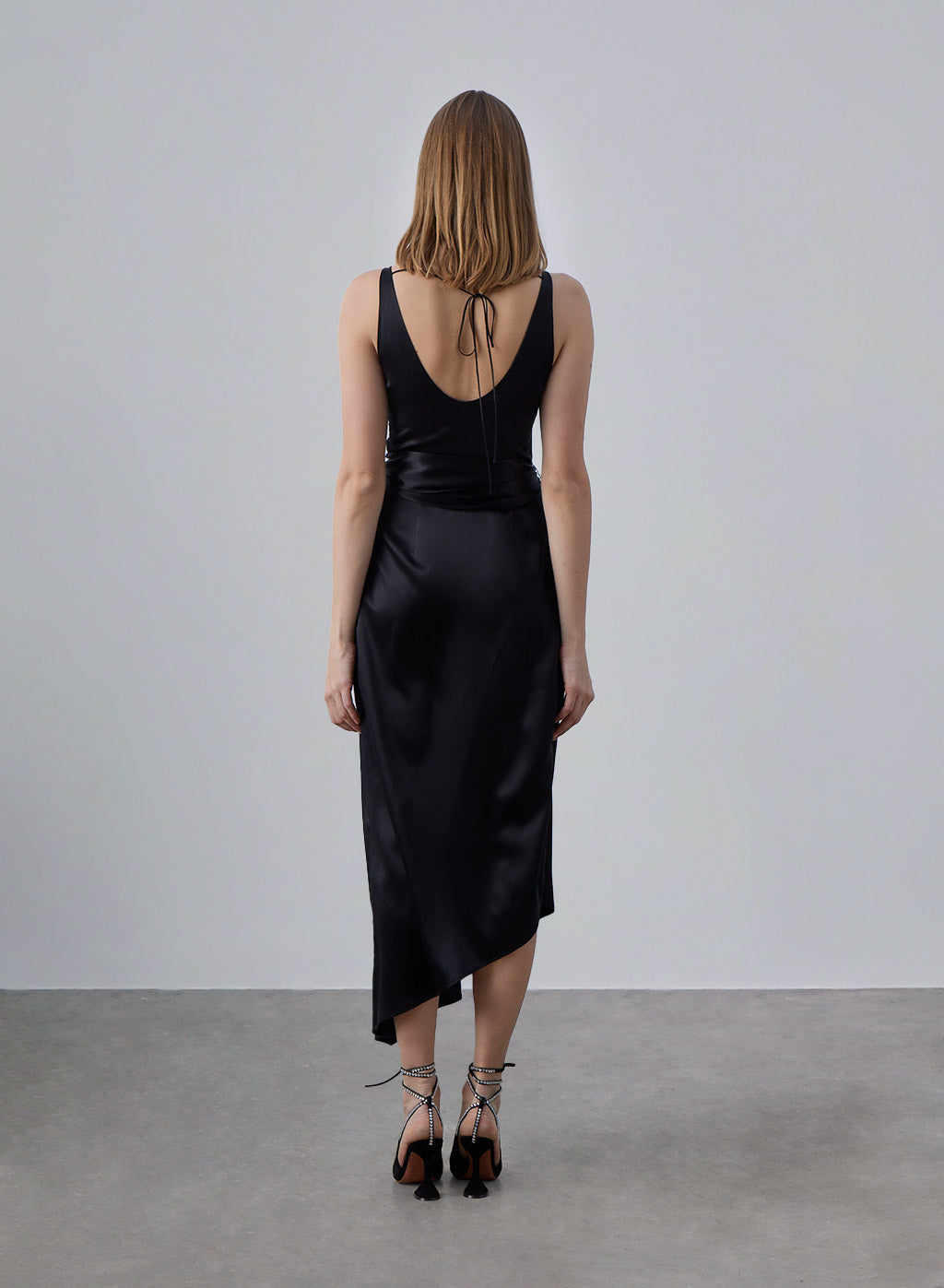 SKU:BlackBeltedAsymmetricalSilkyMidiDress-XS