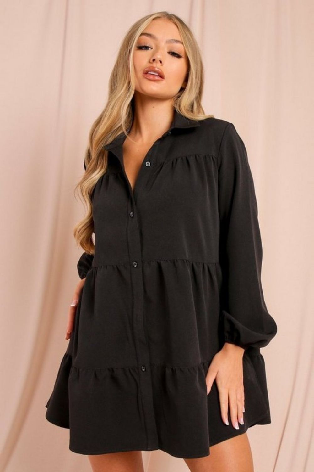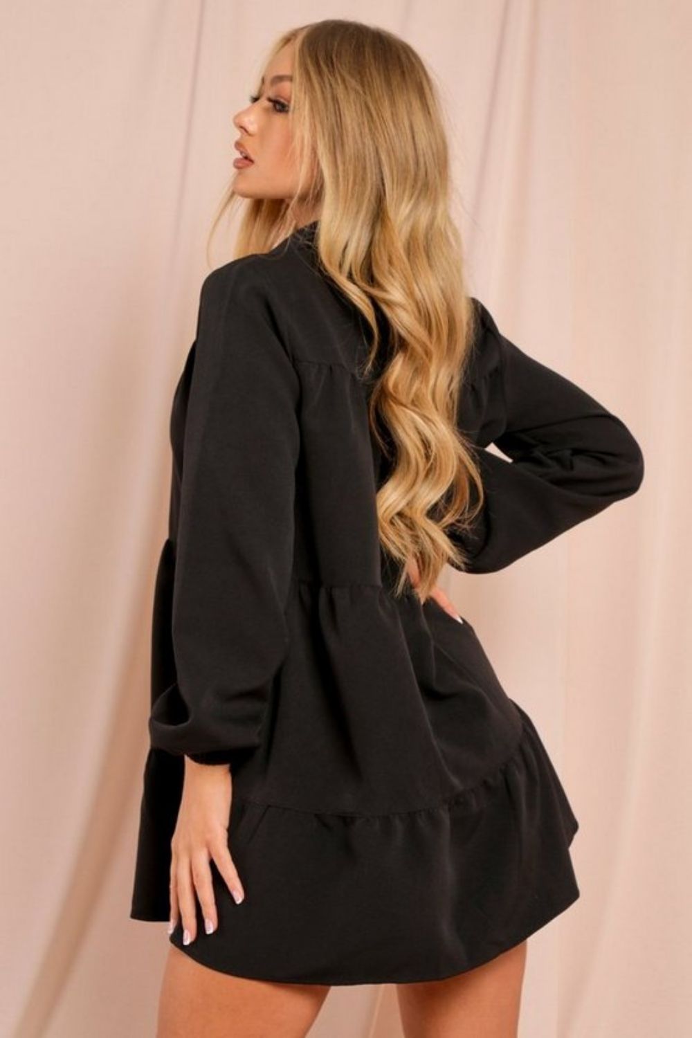 SKU:BlackCollarNeckMiniFlaredDress-XS