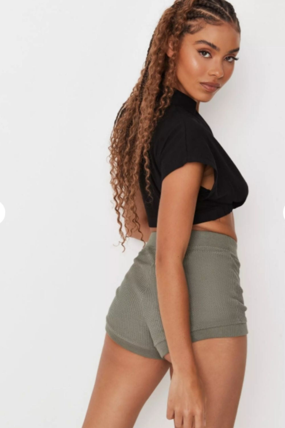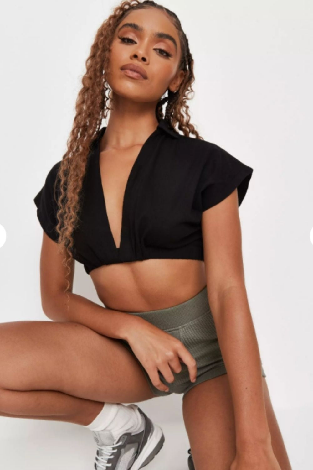 SKU:BlackcollareddeepvnecklinecroppedTshirt-XS