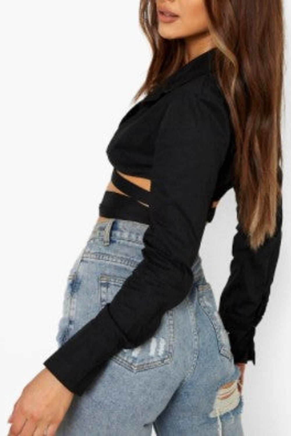 SKU:BlackCottonPoplinTieWaistCroppedShirt-XS