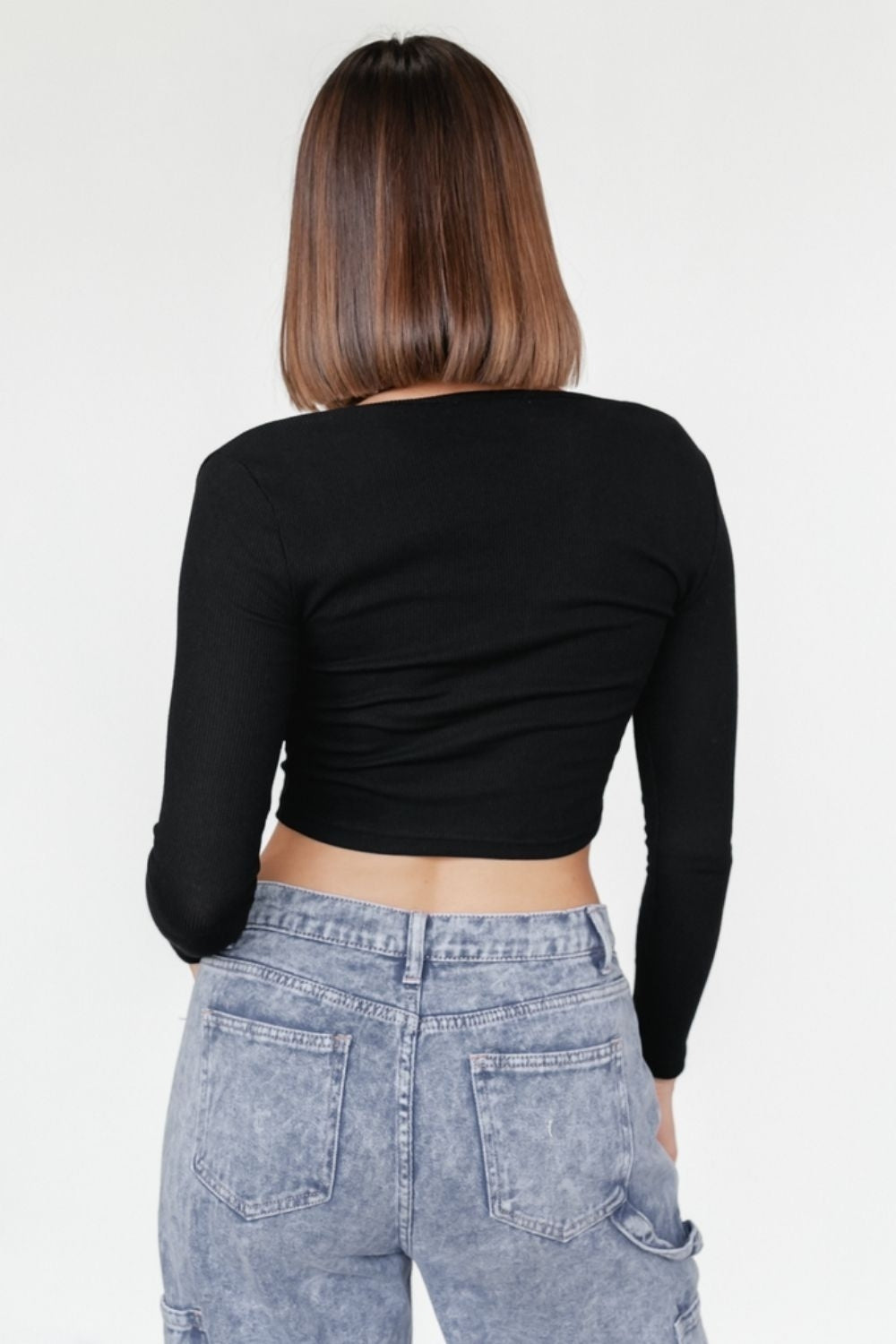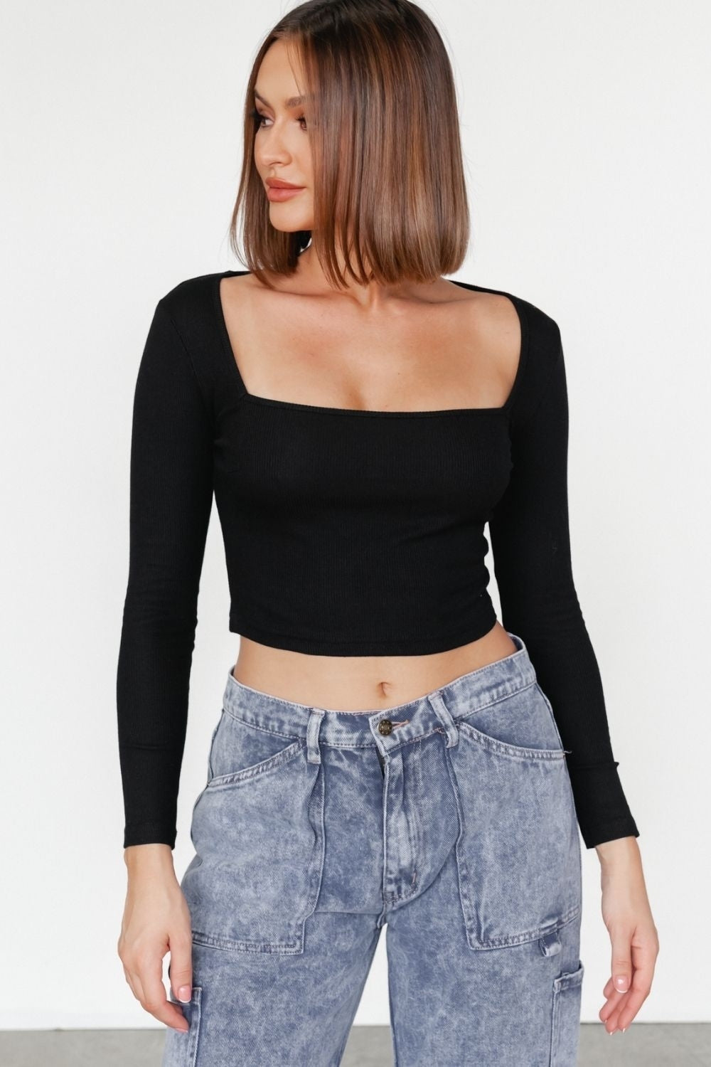 Introducing our must-have Black Crop Top with a sleek Square Neckline, designed to effortlessly elevate your summer wardrobe. Crafted from premium ribbed fabric, this top boasts a slim fit and full sleeves, making it a versatile piece for both casual outings and evening gatherings.