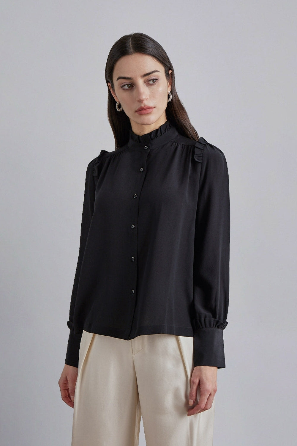 With its timeless design and versatile styling options, the Black Frilled Cuff Blouse Top is a wardrobe essential that effortlessly combines fashion and comfort. Elevate your style game with this must-have piece and make a statement wherever you go.