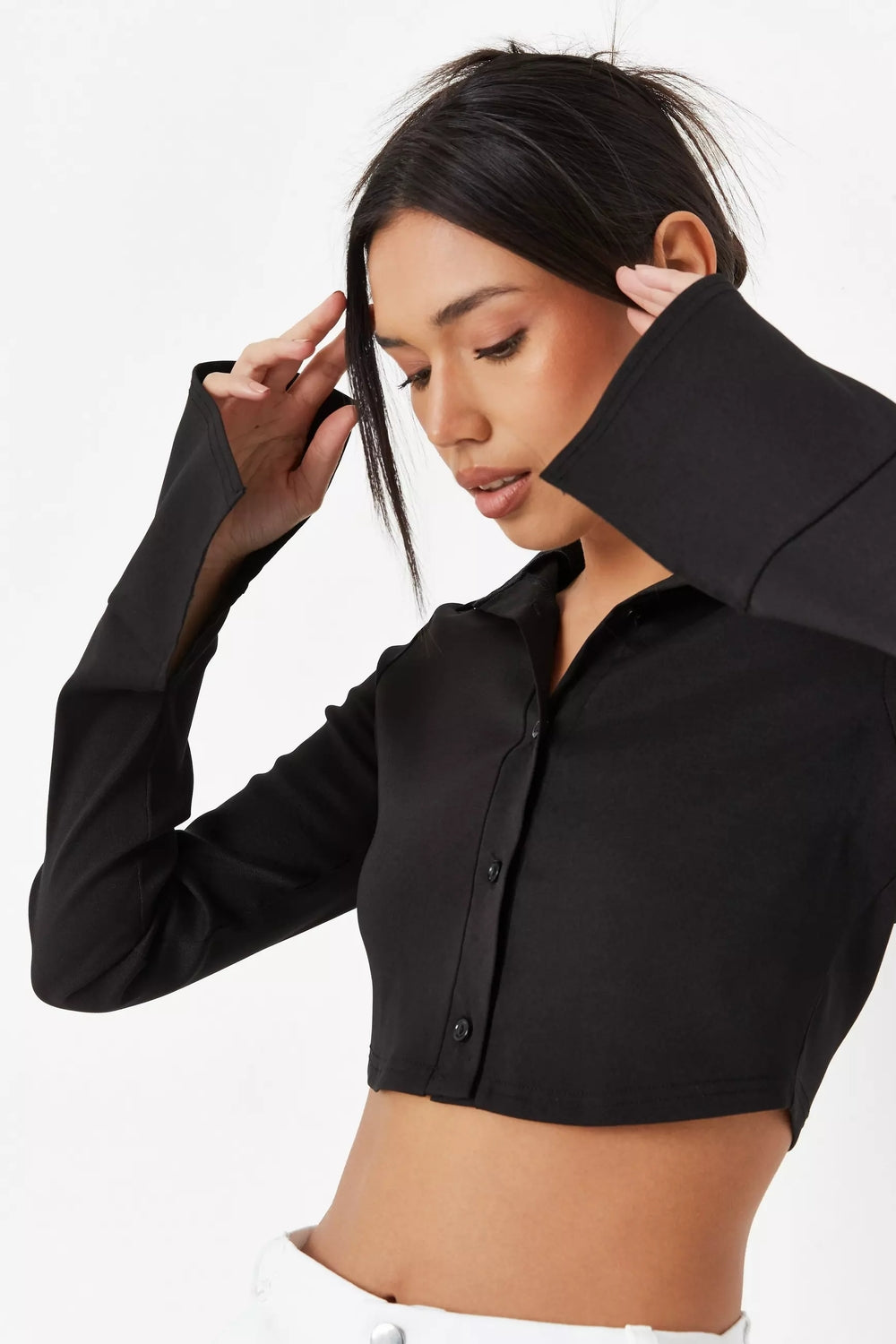 Casual Chic: Pair the Black Poplin Curved Hem Shirt with distressed denim jeans and white sneakers for a laid-back yet stylish look perfect for weekend brunches or coffee dates.
