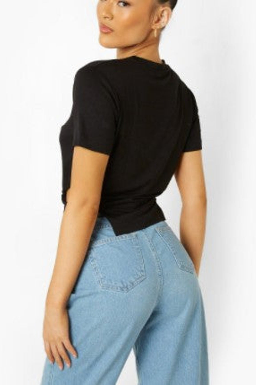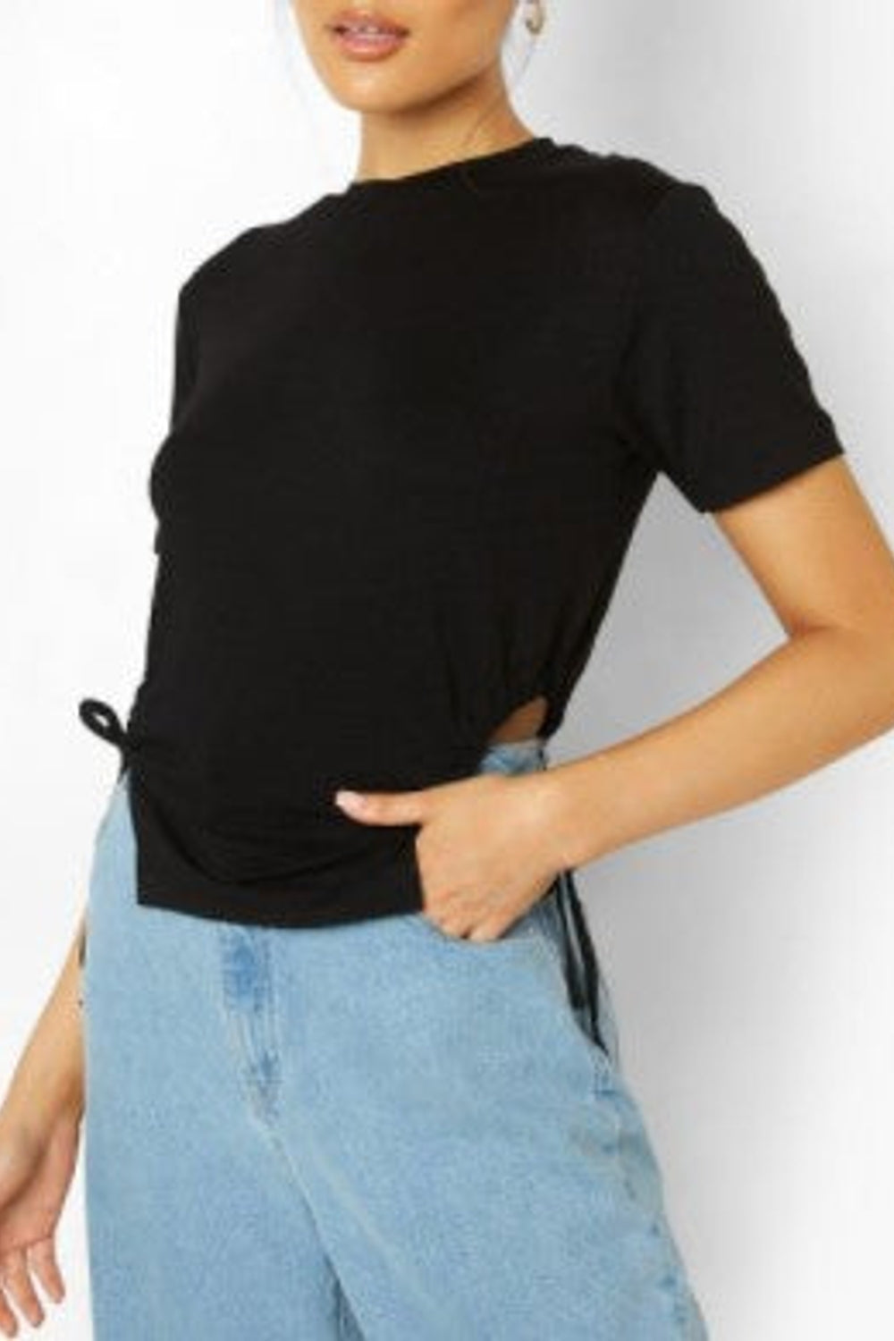 Not only does this t-shirt look great, but it's also designed to last. With proper care, it will maintain its shape and color wash after wash, ensuring long-lasting wearability season after season. Invest in quality pieces like our Black Rouched Cut Out Sides T-shirt, and you'll have a go-to staple that never goes out of style.