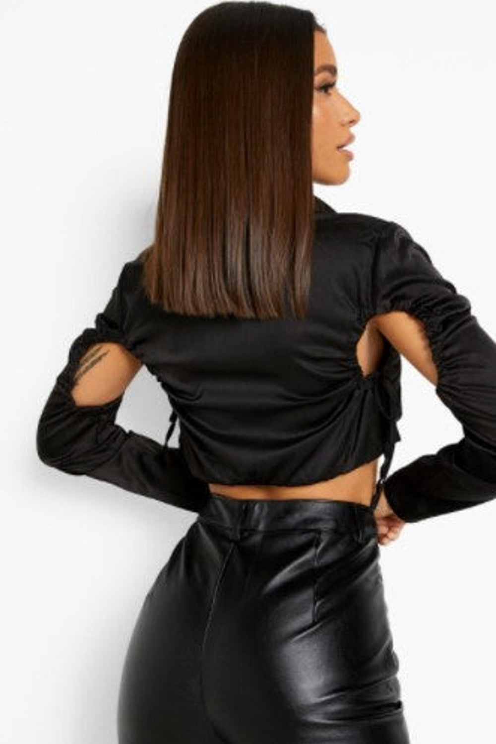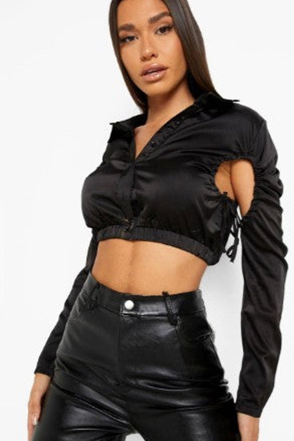 Black Satin Ruched Detail Cropped Shirt