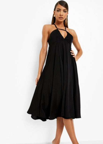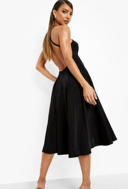 SKU:BlackStrappyBackPleatedMidiSkaterDress-XS