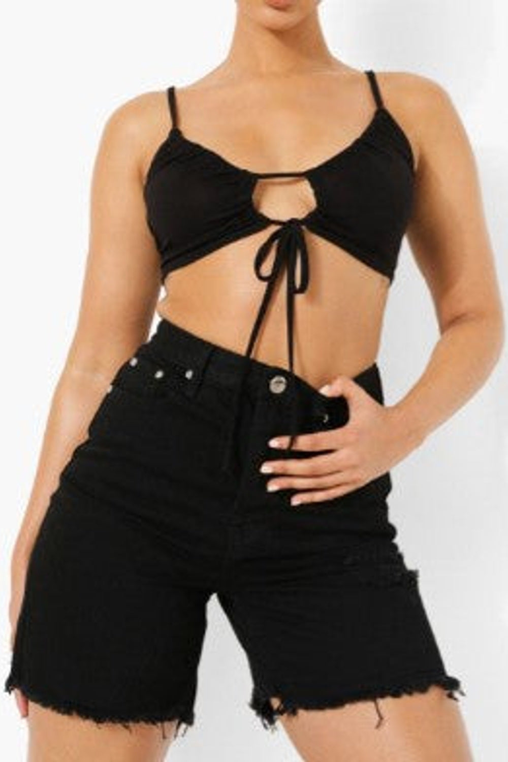 Formal Affair: Pair the Black Tie Detail Strap Bralet with high-waisted tailored trousers and statement heels for a chic and sophisticated look perfect for black-tie events or formal dinners. Add a clutch bag and subtle jewelry to complete the ensemble.