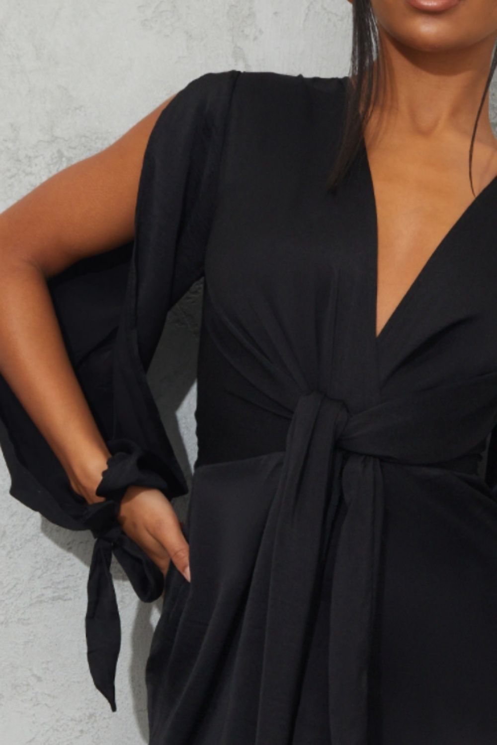 SKU:BlackTieKnotDetailsatSleevesMinDress-XS