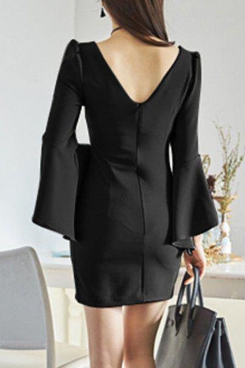 SKU:BlackVNecklineFlareSleeveDress-XS