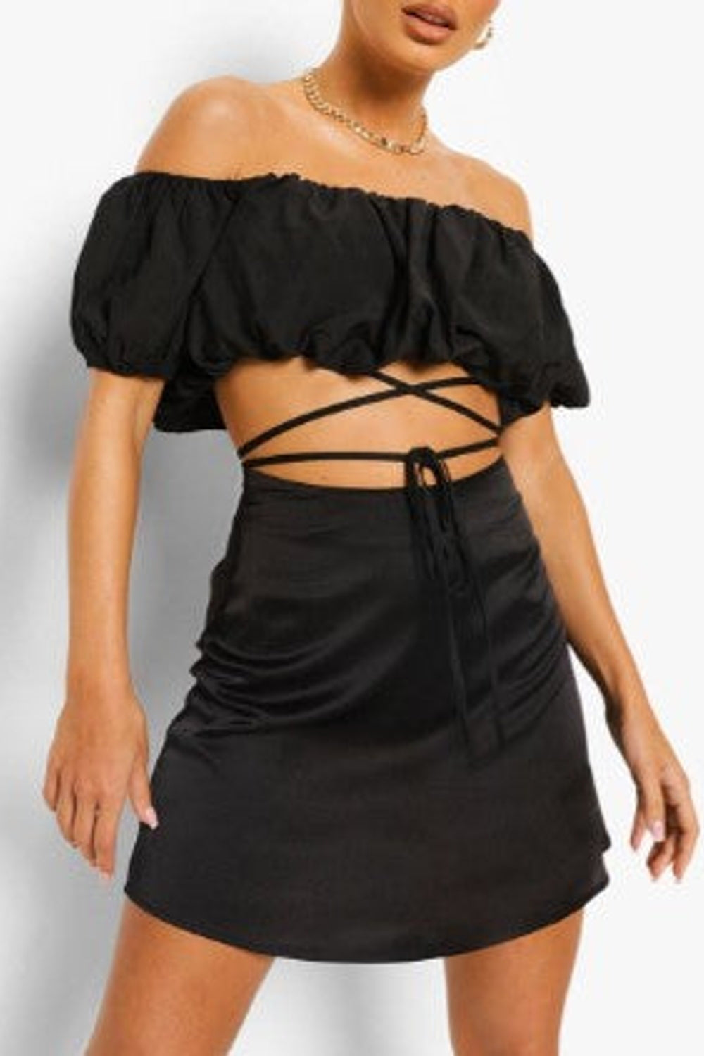Black Woven Off The Shoulder Tie Waist Crop Top