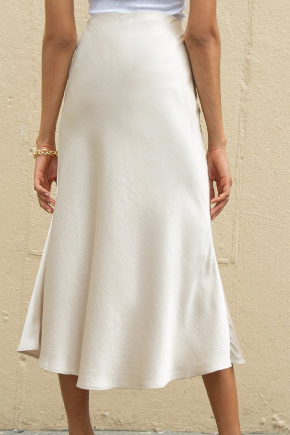 Bored of the regular cotton skirts? White mid-length skirt with designer white buttons at the center front. A- line silhouette and high waist. Made of Lycra fabric.