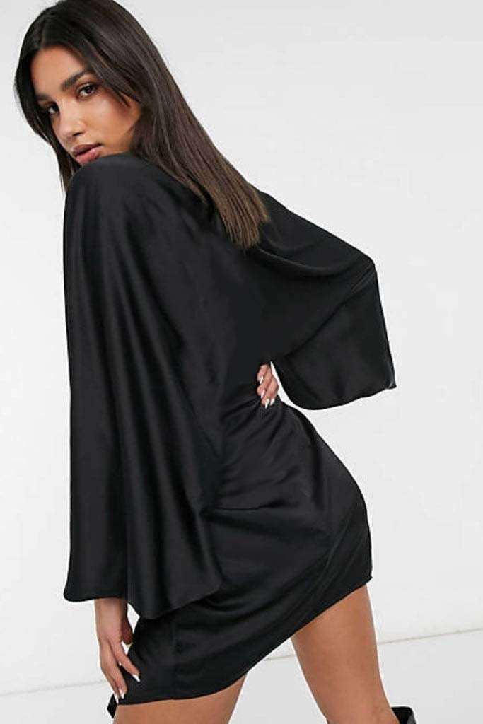 Type- Blouson Sleeve Satin Shirt Mini Dress Open Back In Black