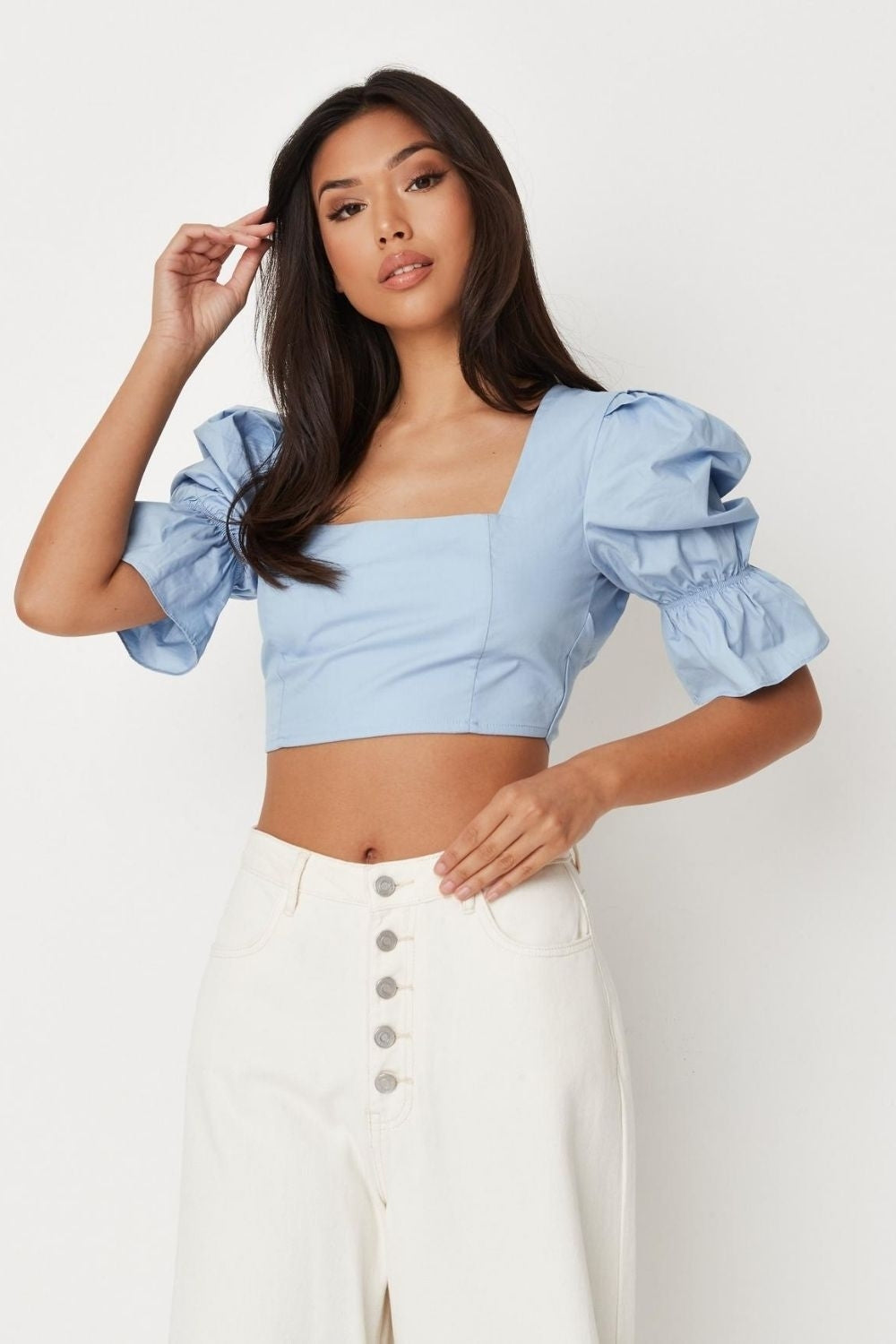 Type- Blue MIilkmaid Sleeve Open Back Poplin Crop Top