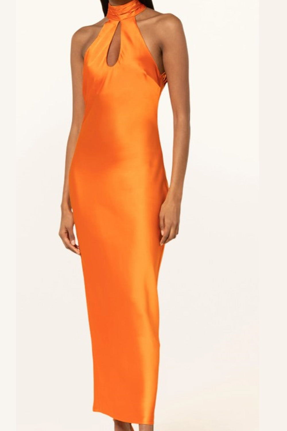 Type-Botanical Orange Dress, Color-Orange, Neck type-Keyhole neckline, Sleeve Length-Sleeveless, Fit-Body Fit, Fabric-Satin