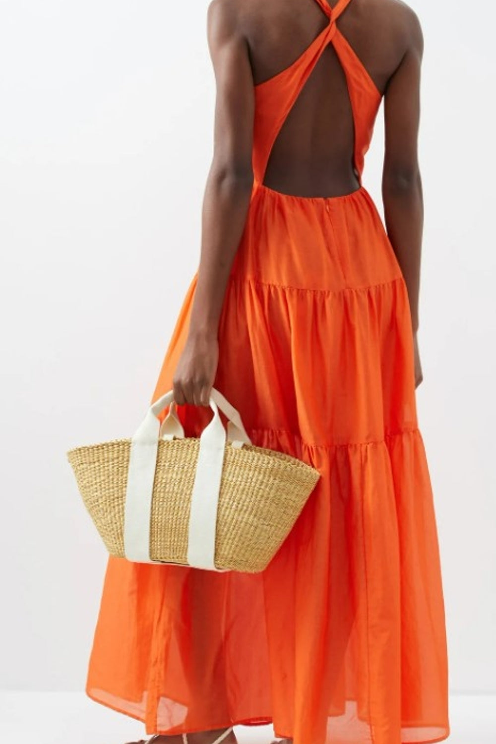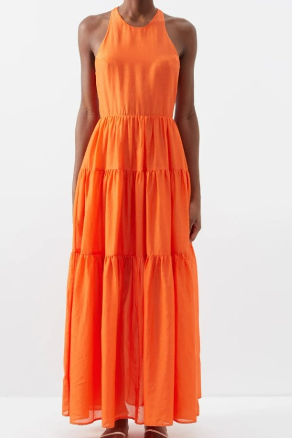 Type-Brampton Orange Dress, Color-Orange, Neck type-Round Neck, Sleeve Length-Sleeveless, Fit-Regular, Fabric-Rayon