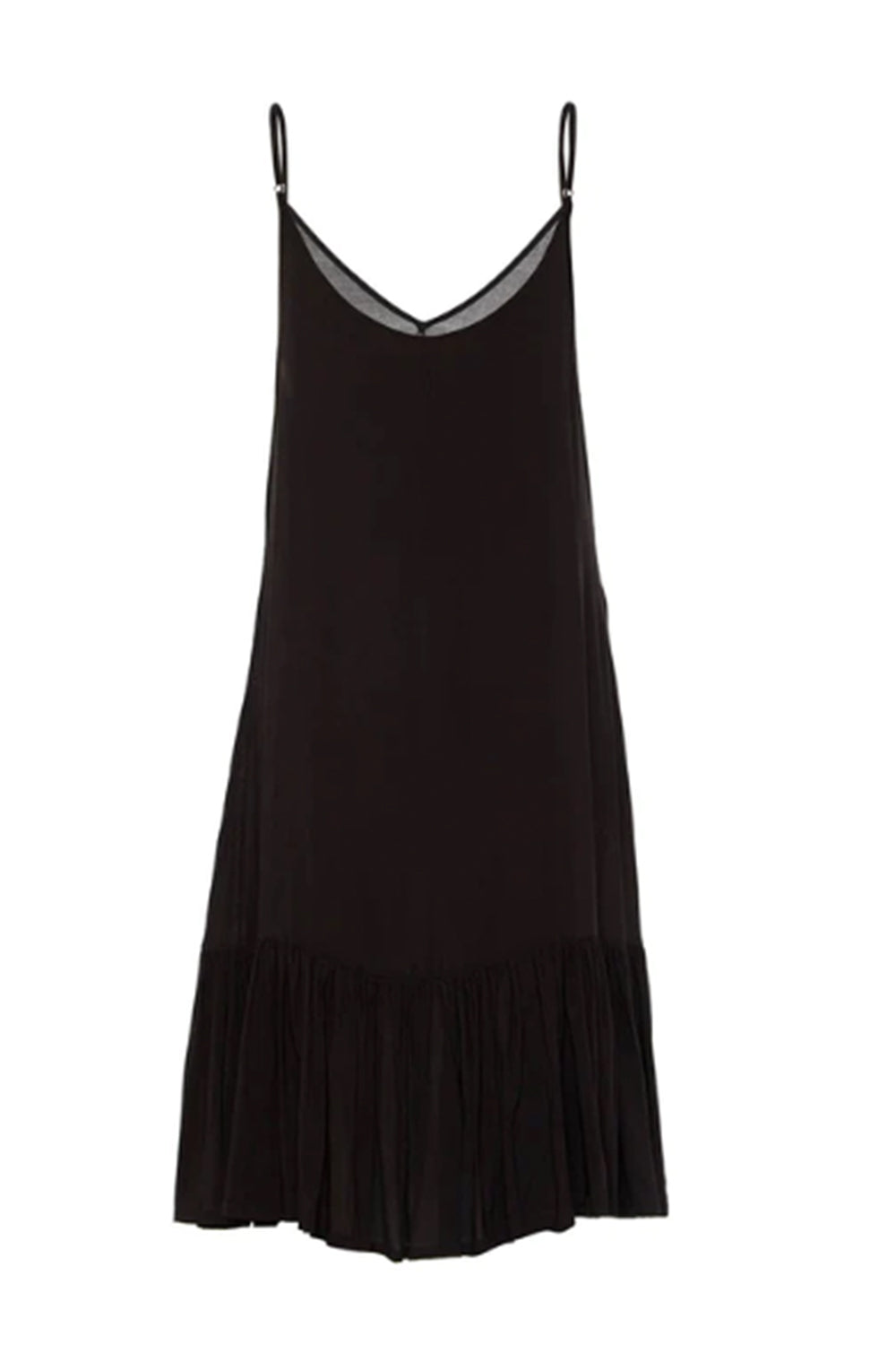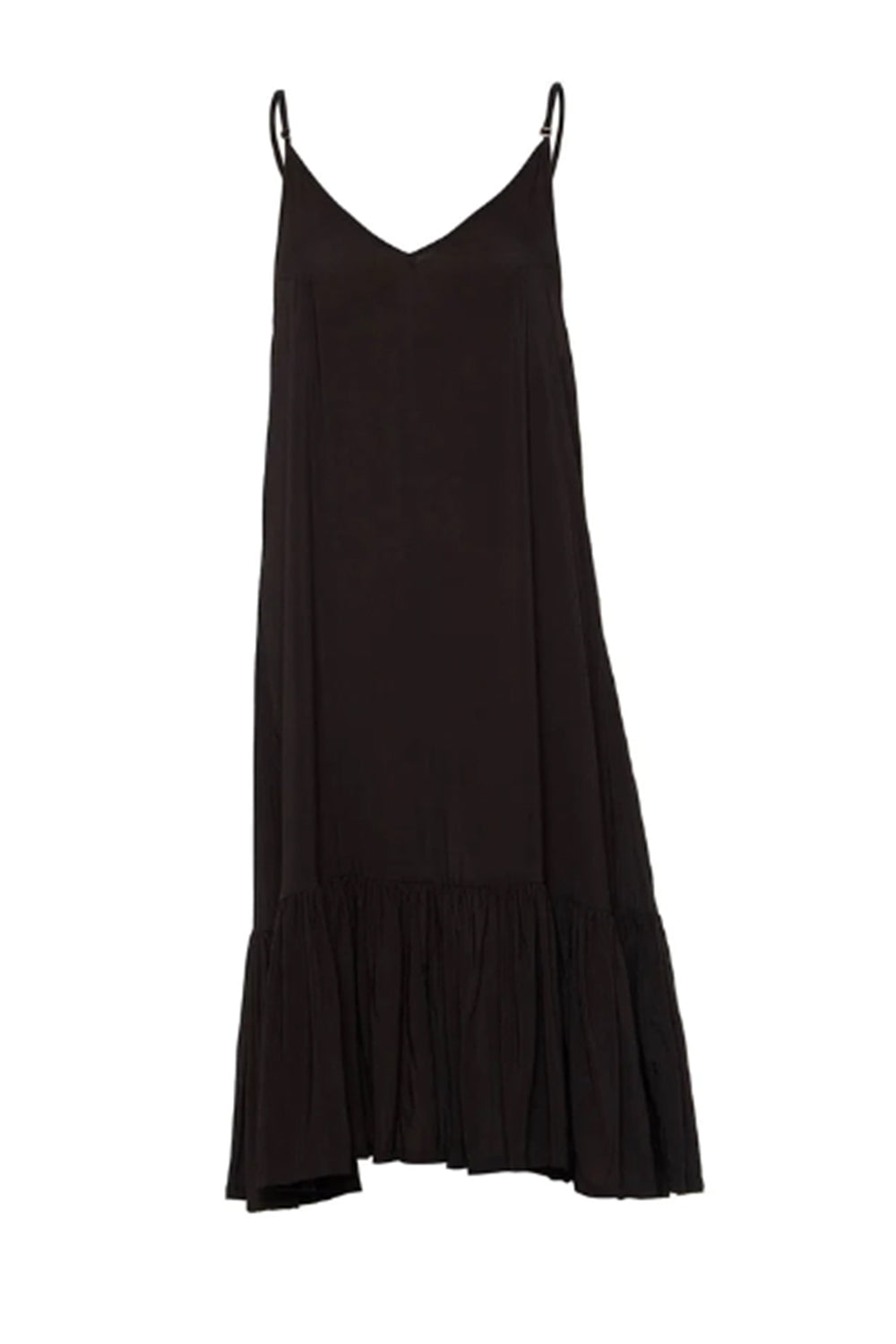 Type: CALM FLOWY BLACK DRESS Color: Black Neck Type: V Neck Sleeve Length: Sleeveless Fit: Relaxed Fabric: Rayon