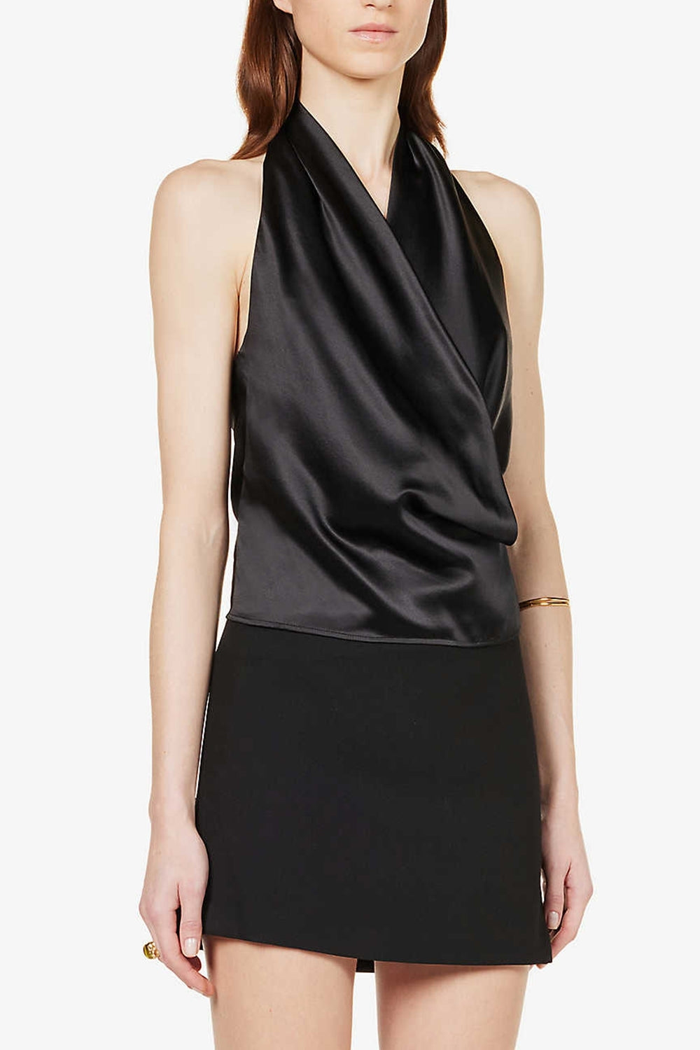 Introducing the Cascade Drape Black Top – a timeless piece that effortlessly blends sophistication with modern flair. This sleeveless top features a luxurious satin fabric that drapes gracefully, adding a touch of opulence to your ensemble. The rich black color exudes elegance, making it a versatile addition to your wardrobe.