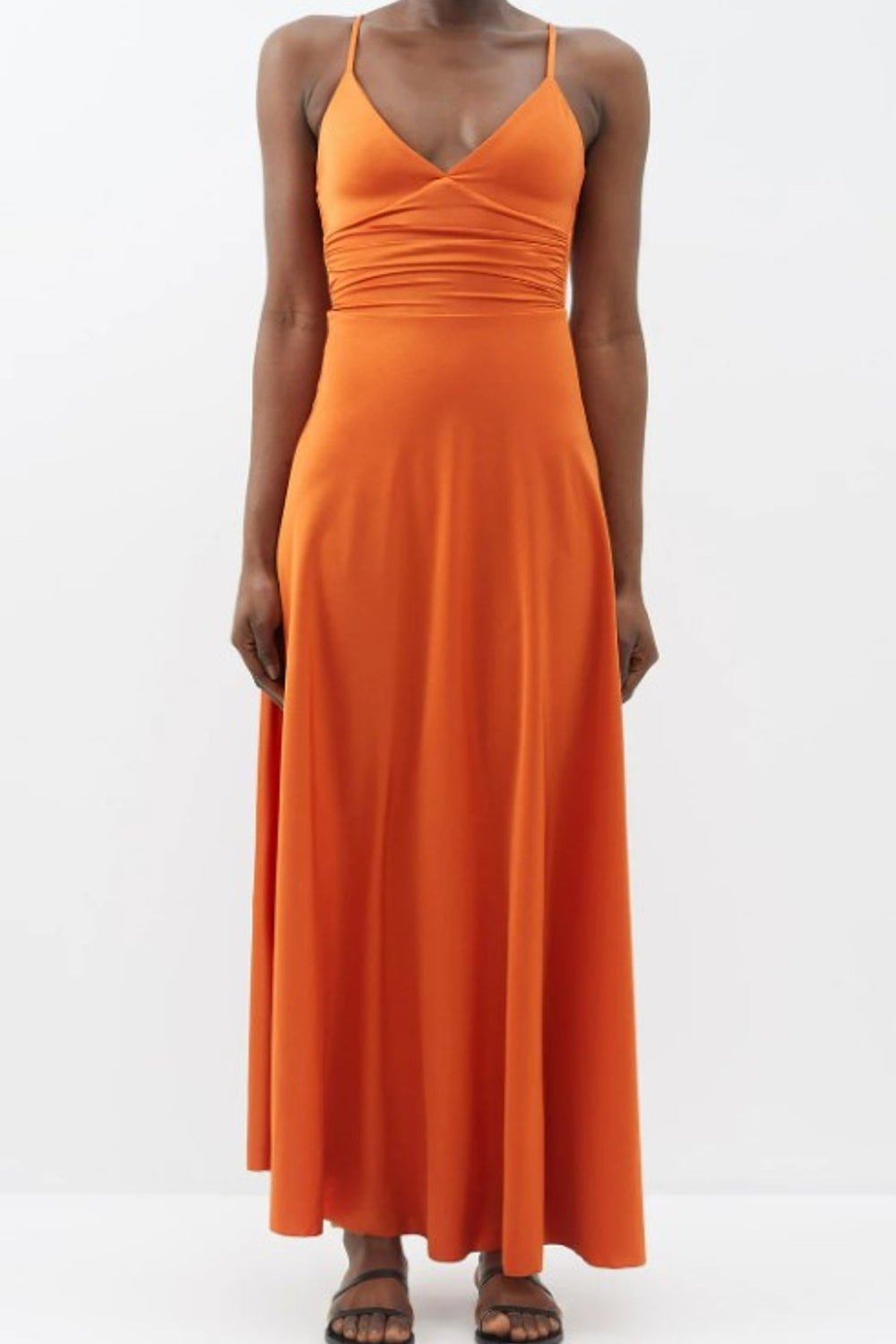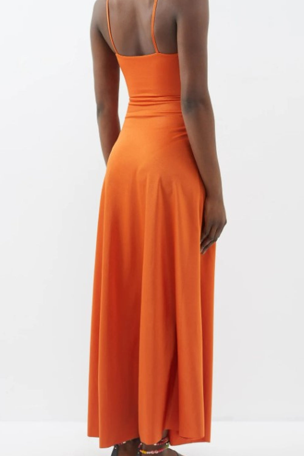 Type-Cheongdo Orange Dress, Color-Orange, Neck type-V Neck, Sleeve Length-Sleeveless, Fit-Regular, Fabric-Poly Lycra