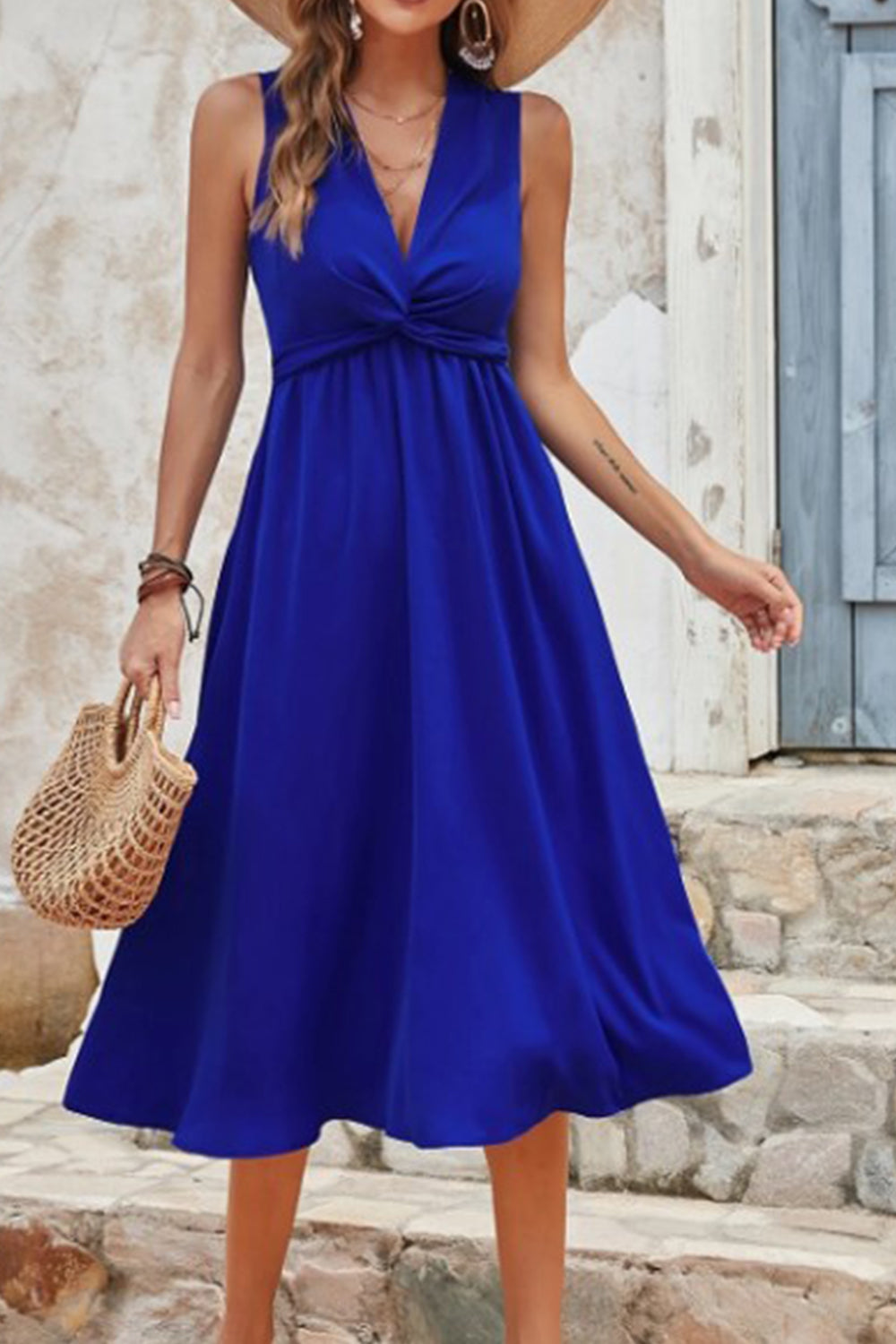 Type-Chiswick Royal Blue Dress Color-Royal Blue Neck type-V Neck Sleeve Length-Sleeveless Fit-Fit & Flare Fabric-Poly Lycra