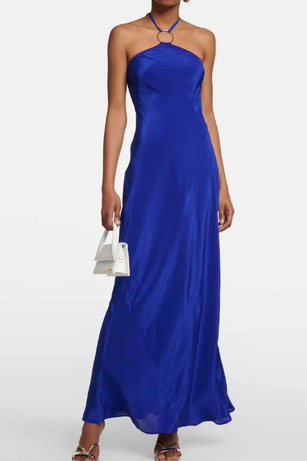 Type-Chungju Blue Dress, Color-Blue, Neck type-Halter Neck, Sleeve Length-Sleeveless, Fit-Body Fit, Fabric-Satin Lycra