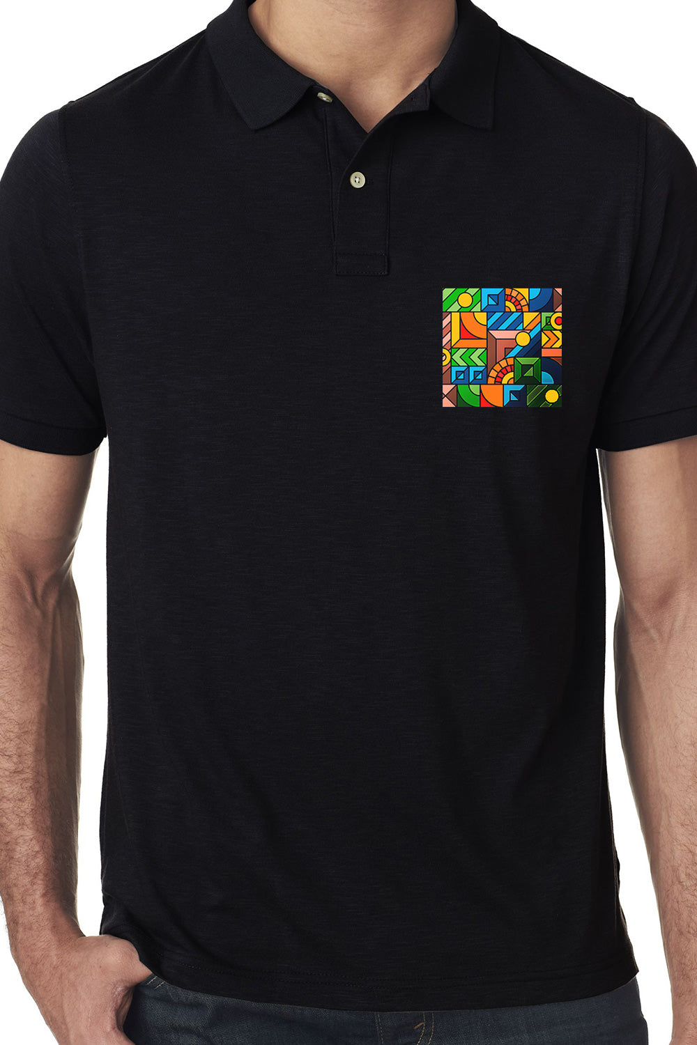 Colorful geometric shapes patch printed on a black polo Tee pocket area! Perfect for office and leisure. Can go with jeans or joggers and formal or sneaker shoes.