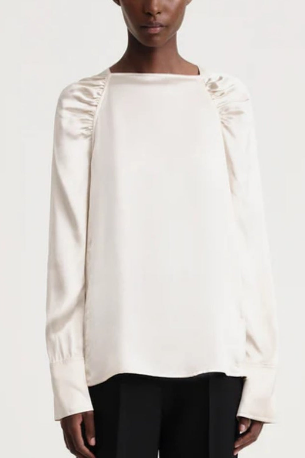 Type-Convivial White Top, Color-White, Neck type-High Square Neck, Sleeve Length-Full Sleeve, Fit-Relaxed, Fabric-Satin Lycra