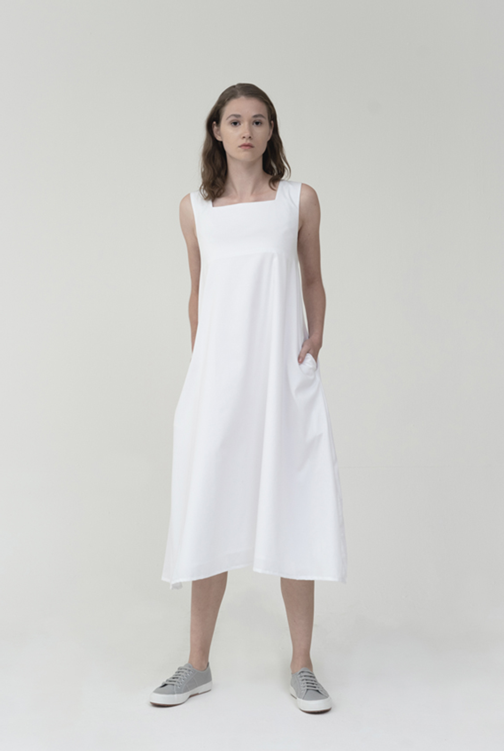 Type-Curious White Dress, Color-White, Neck type-Square neck, Sleeve Length-Sleeveless, Fit-Relaxed, Fabric-Poplin