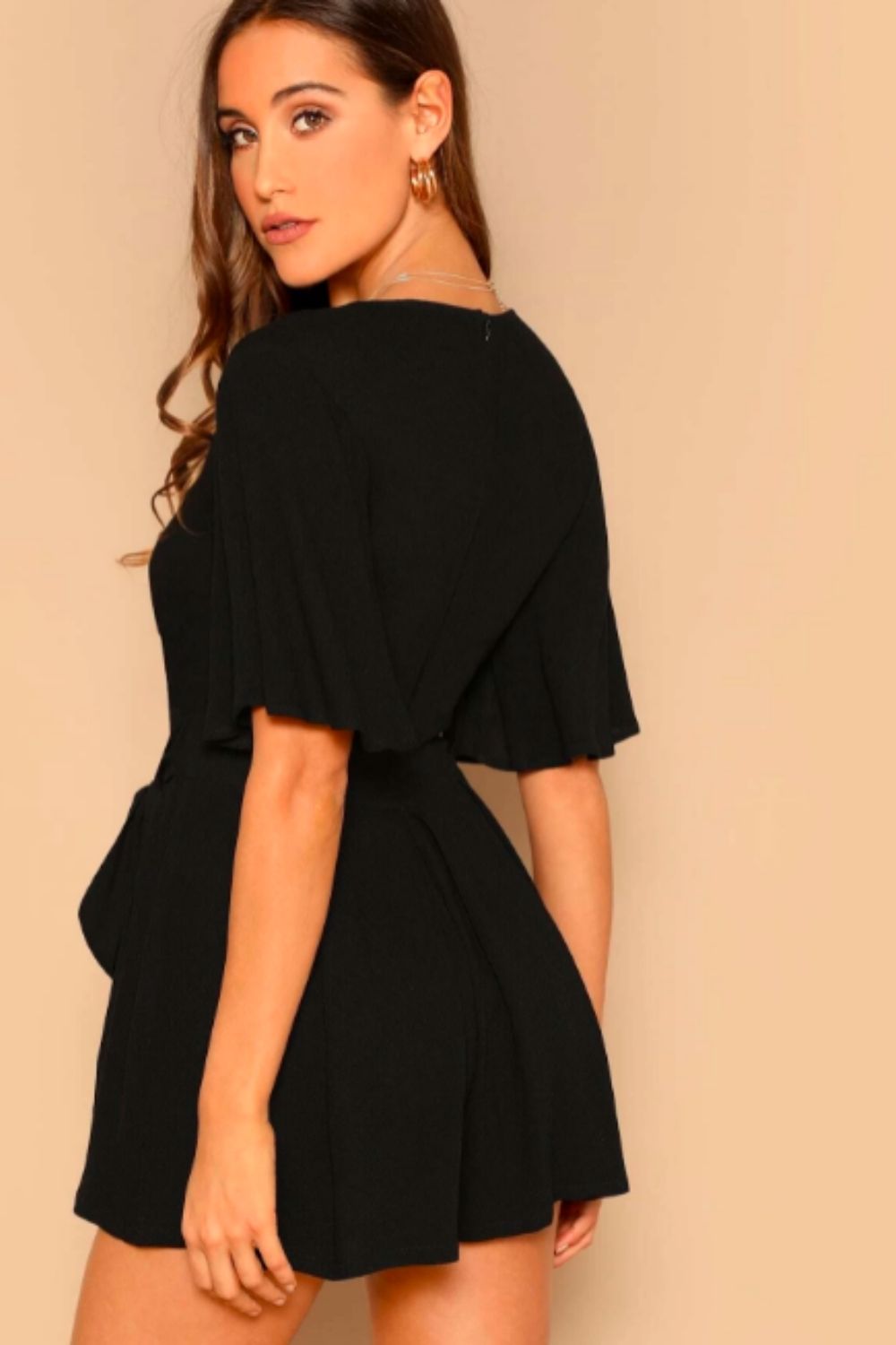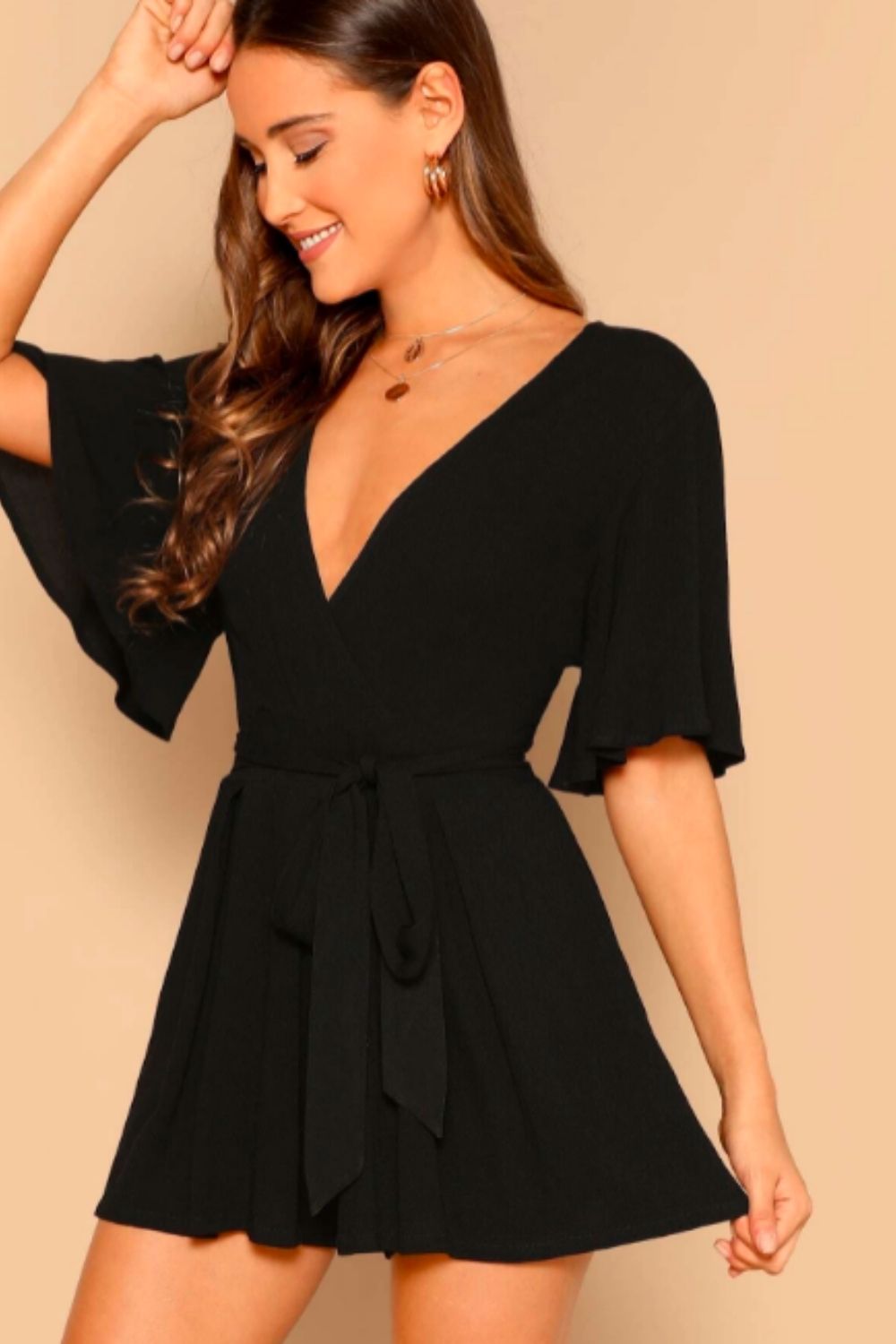 SKU:DeepVNeckFlutterSleeveBeltedPlaysuit-XS