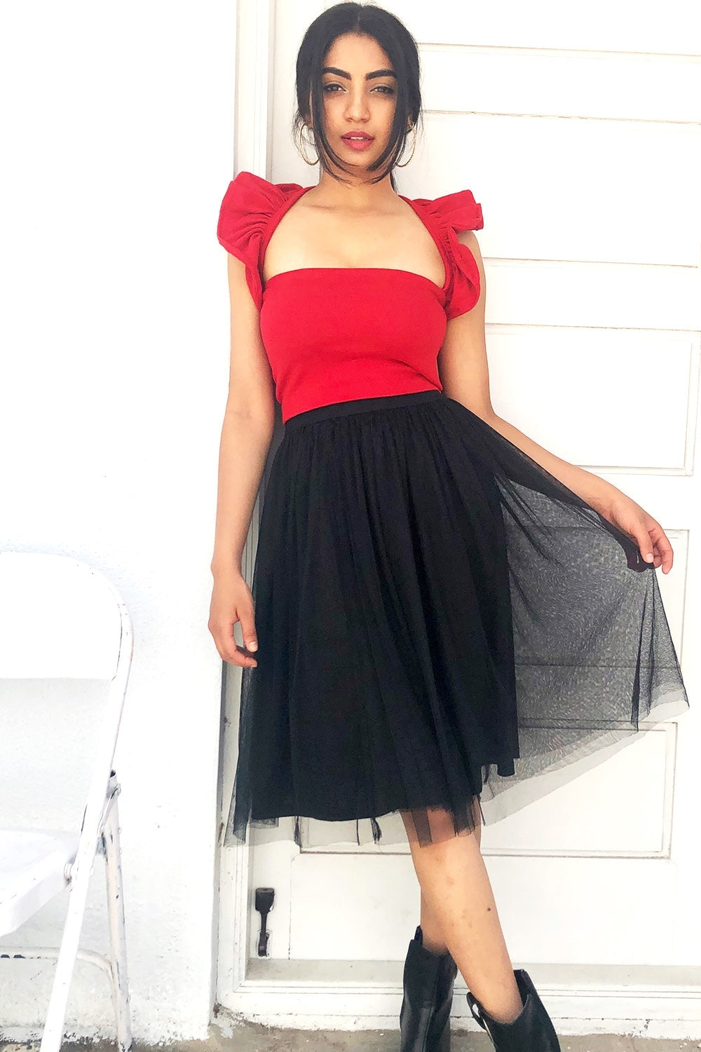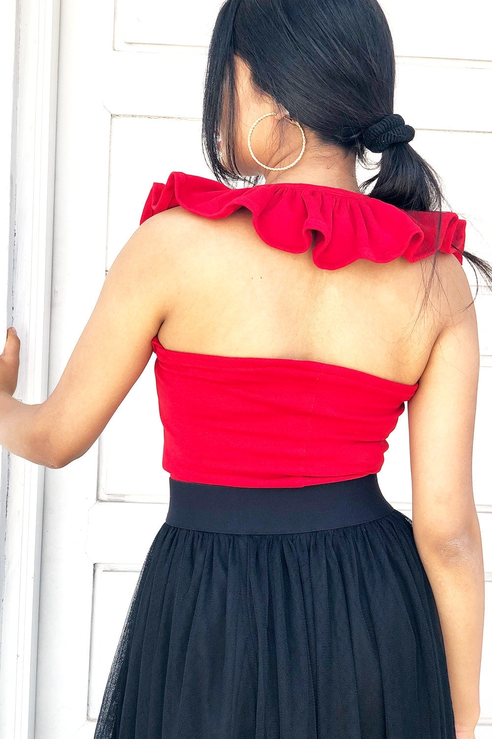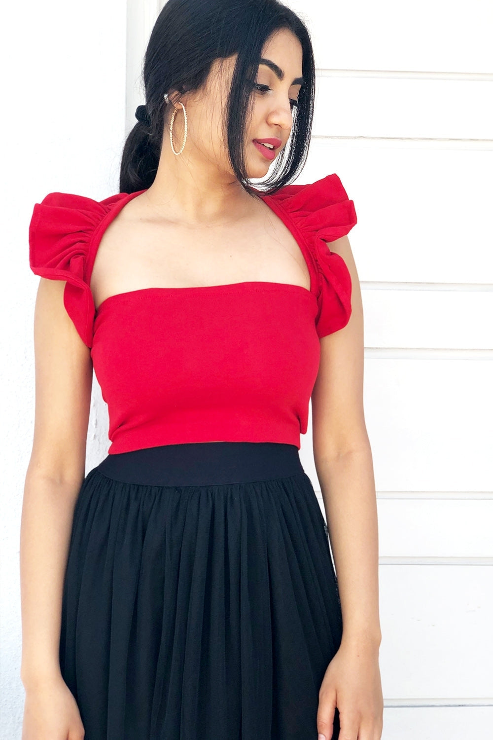 This dreamy tube top with ruffles clinging on to give poise and grace. You can pair this top with tulle skirt and block heels for a Sunday brunch.