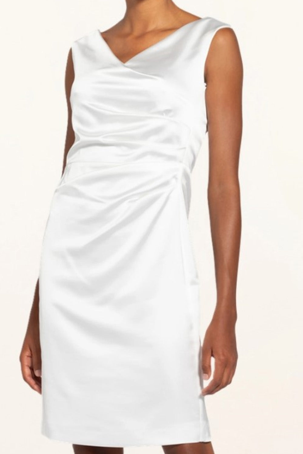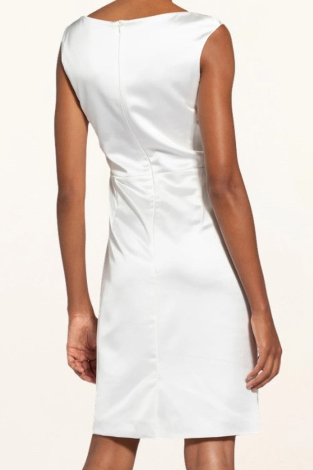 Type-Desert White Dress, Color-White, Neck type-V neck, Sleeve Length-Sleeveless, Fit-Body Fit, Fabric-Satin
