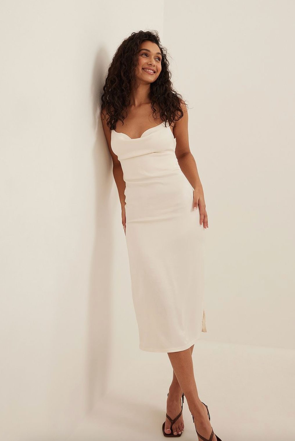 Type-Divinelle White Dress, Color-White, Neck type-Cowl neck, Sleeve Length-Sleeveless, Fit-Body fit, Fabric-satin
