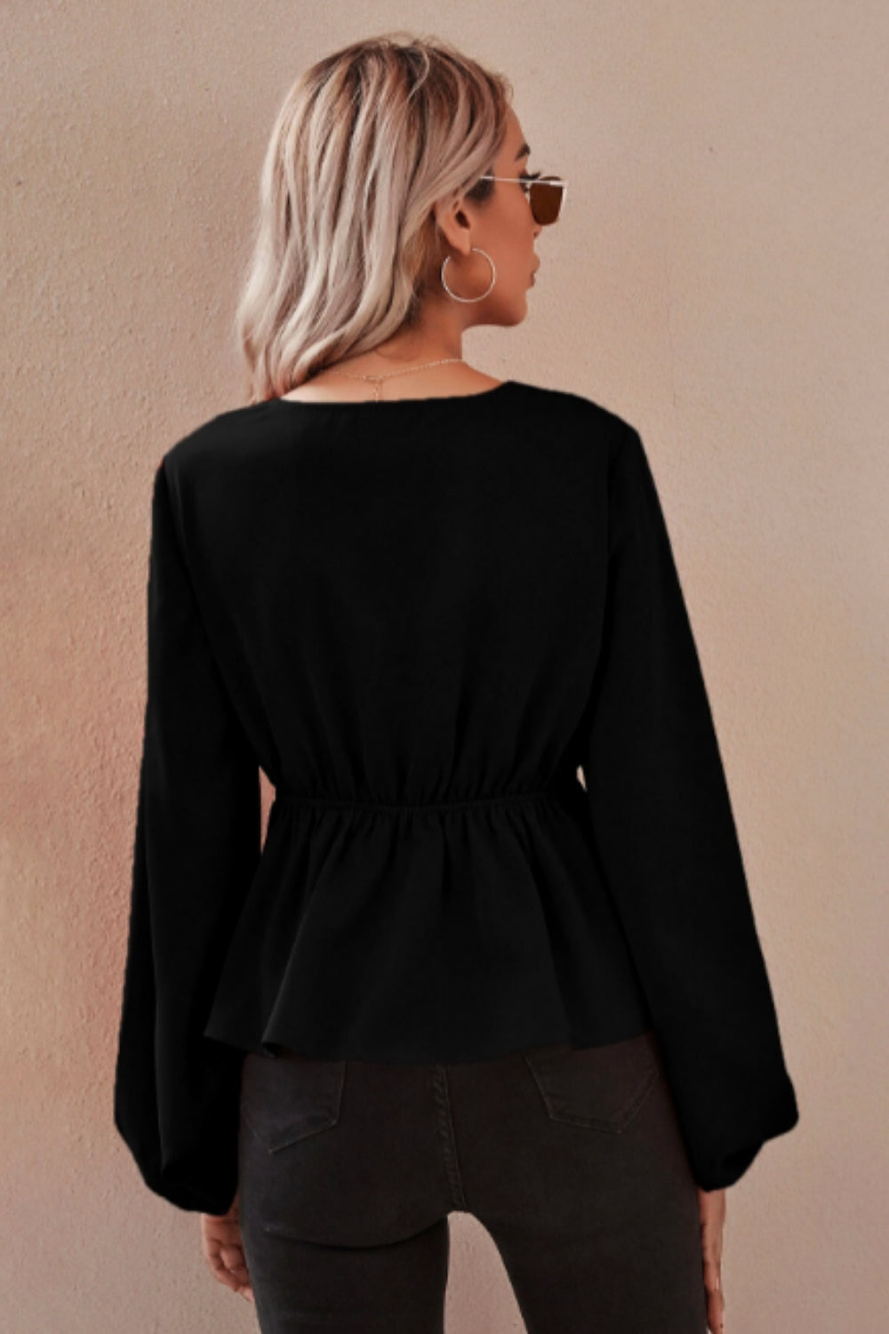 SKU:DrawstringWaistLanternSleeveBabydollBlouse-XS