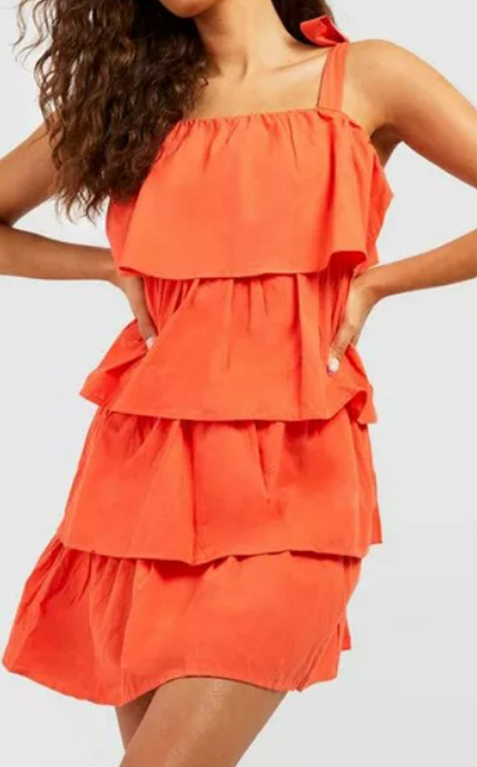Type-Dynamic Orange Dress, Color-Orange, Neck type-Square neck, Sleeve Length-Sleeveless, Fit-Regular, Fabric-Poplin