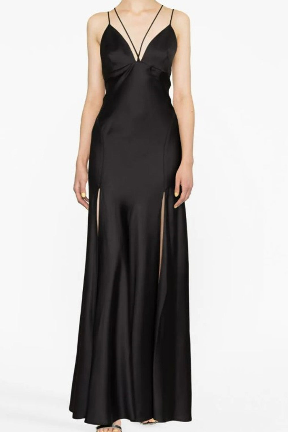 Type-Eclipsia Black Dress, Color-Black, Neck type-V neck, Sleeve Length-Sleeveless, Fit-Regular, Fabric-Satin