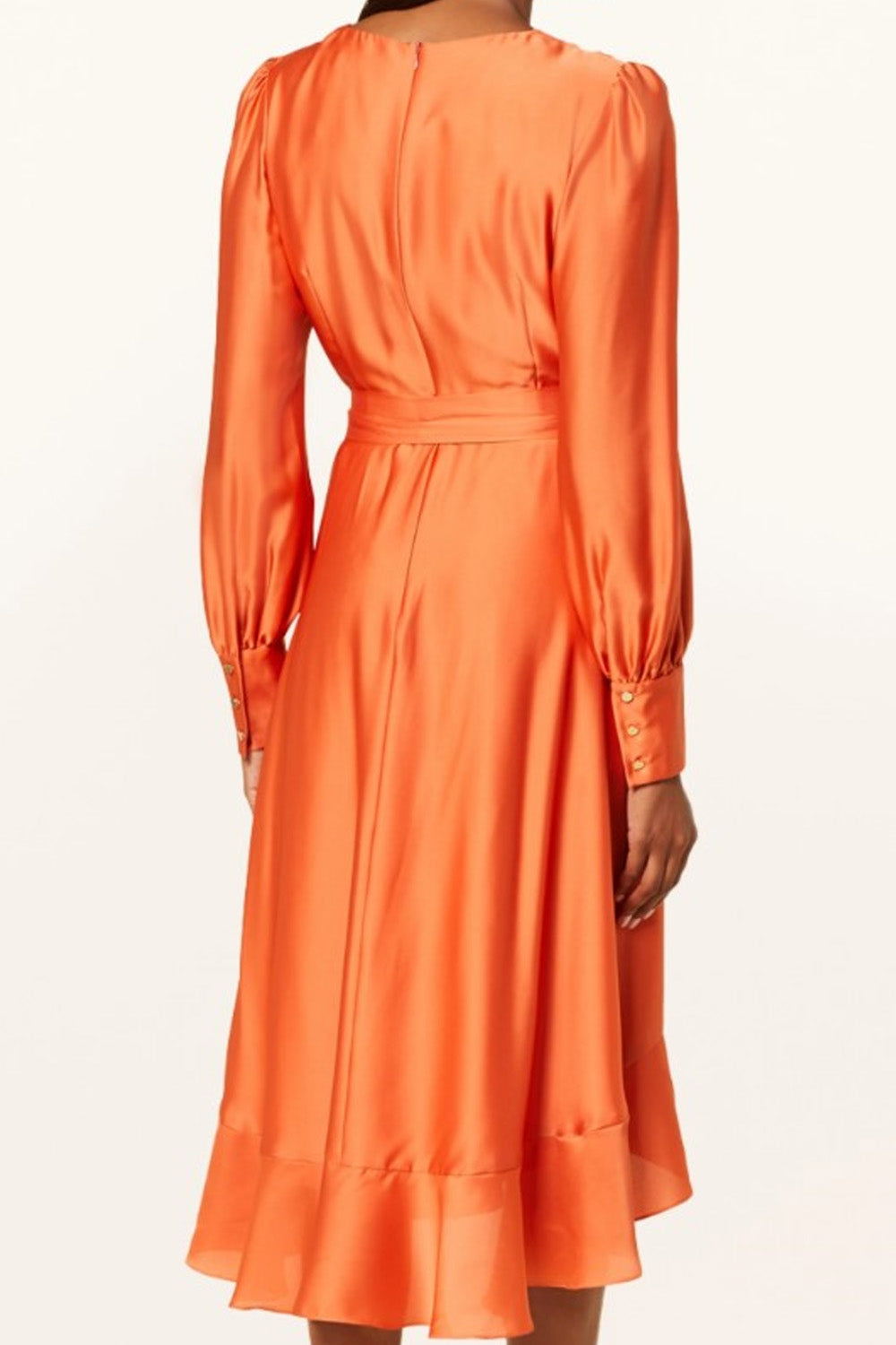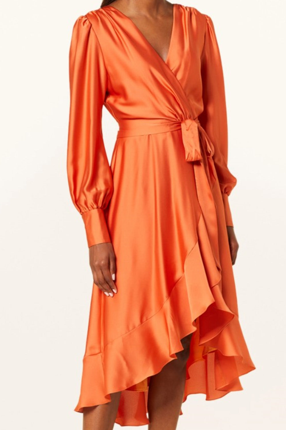 Type-Eco Orange Dress, Color-Orange, Neck type-V neck, Sleeve Length-full length, Fit-Regular, Fabric-Satin