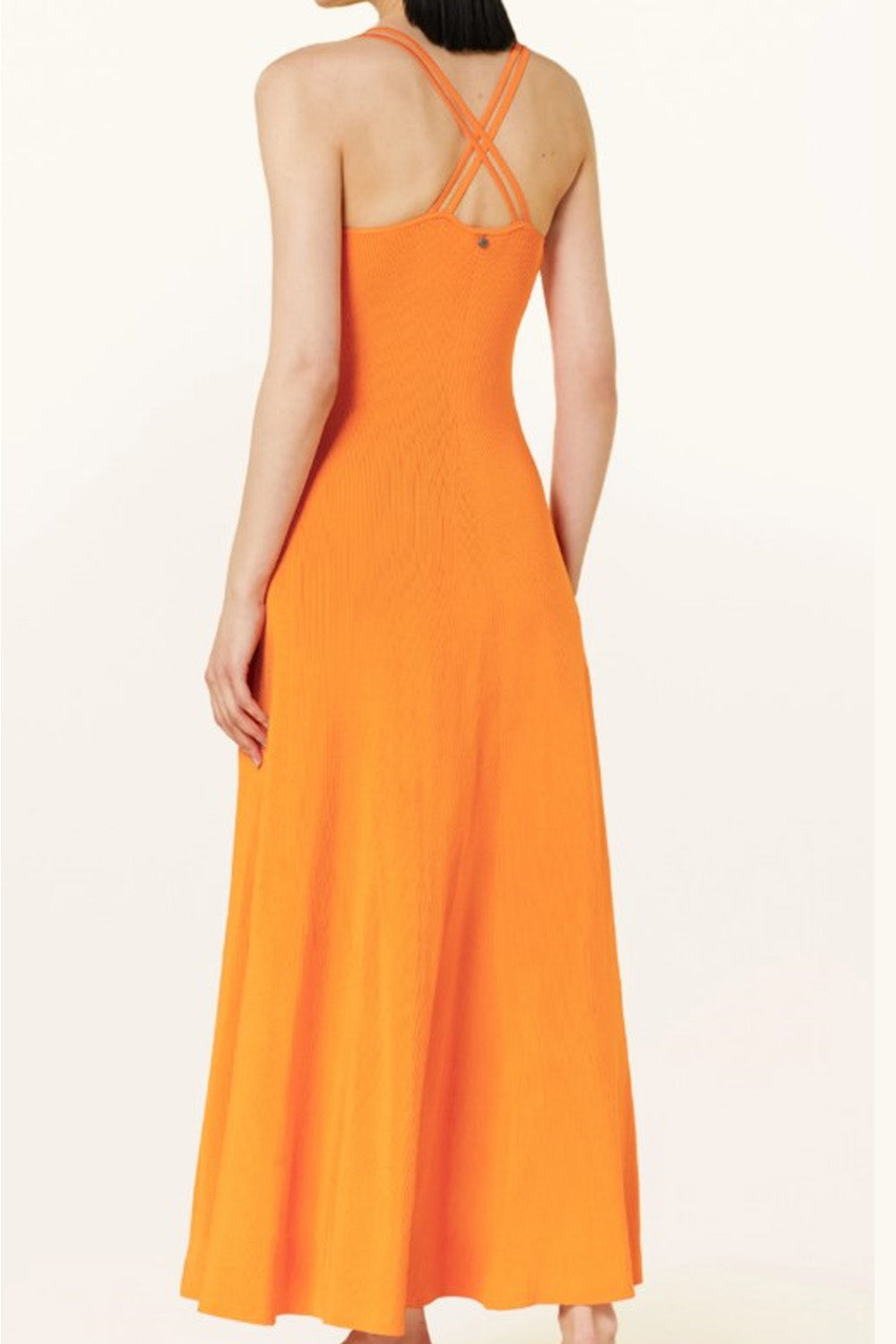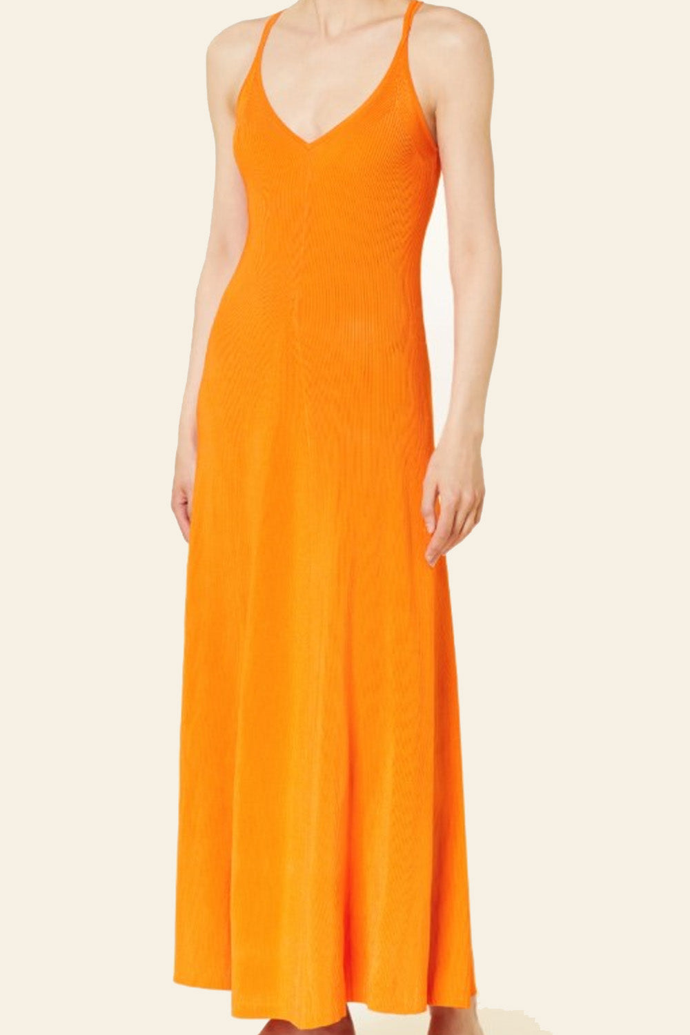 Type-Ecosphere Orange Dress, Color-Orange, Neck type-Deep V neck, Sleeve Length-Sleeveless, Fit-Relaxed, Fabric-Rib