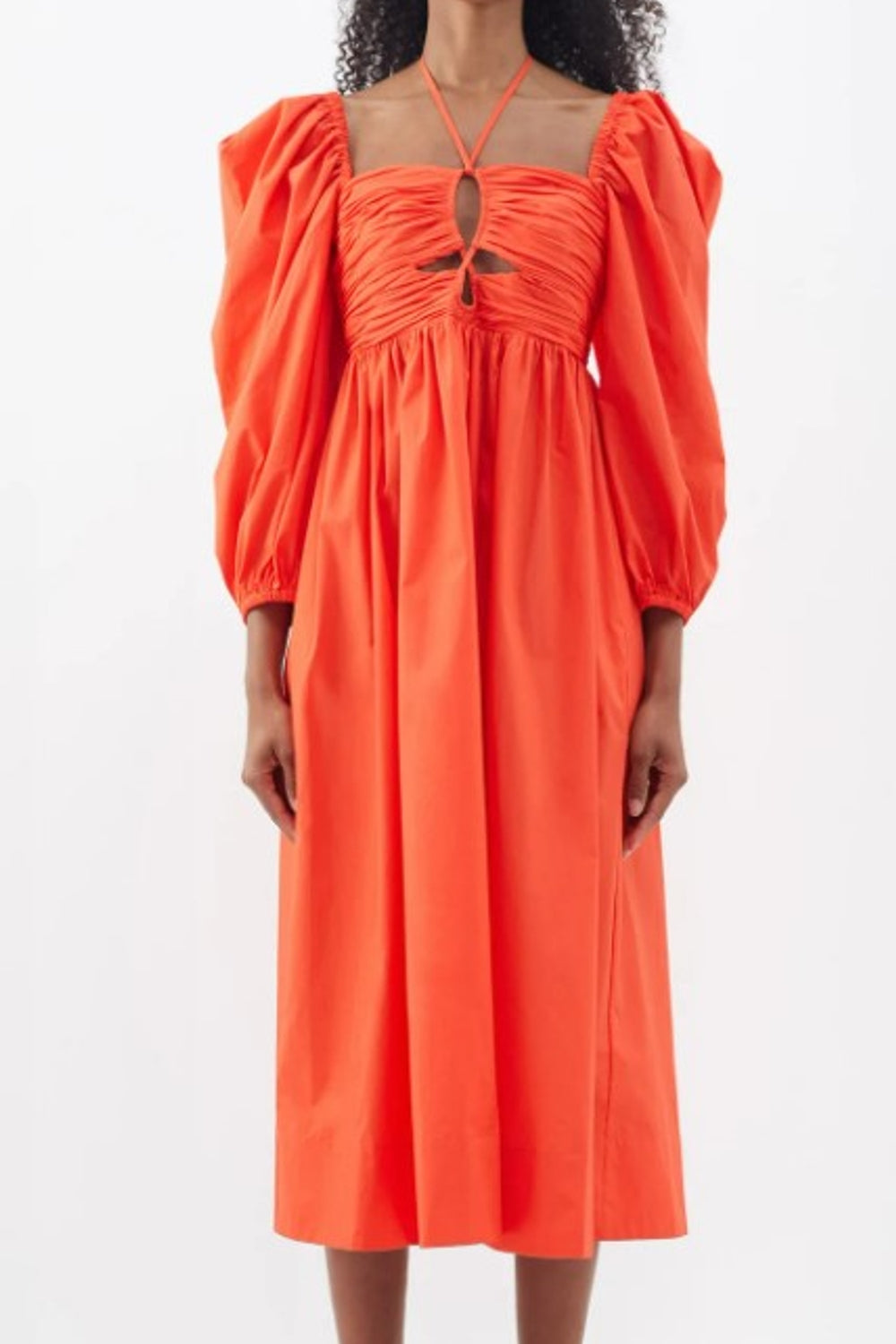 Type-Edmonton Orange Dress, Color-Orange, Neck type-Halter Neck, Sleeve Length-Three Fourth, Fit-Regular, Fabric-Poplin