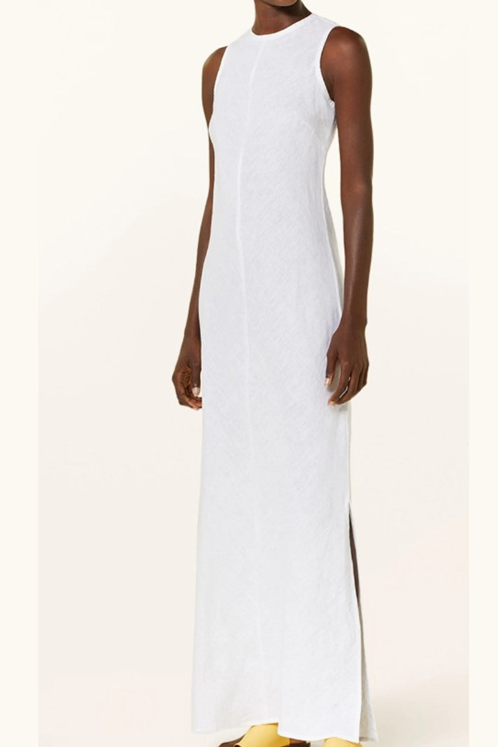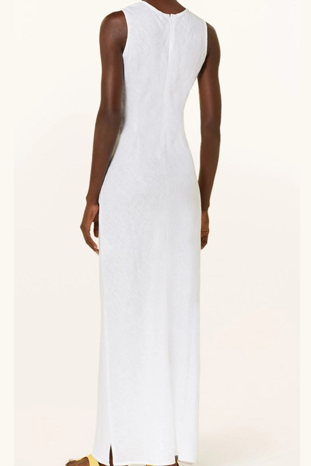 Type-Elegance White Dress, Color-White, Neck type-V Neckline, Sleeve Length-Sleeveless, Fit-Regular, Fabric-Satin Lycra