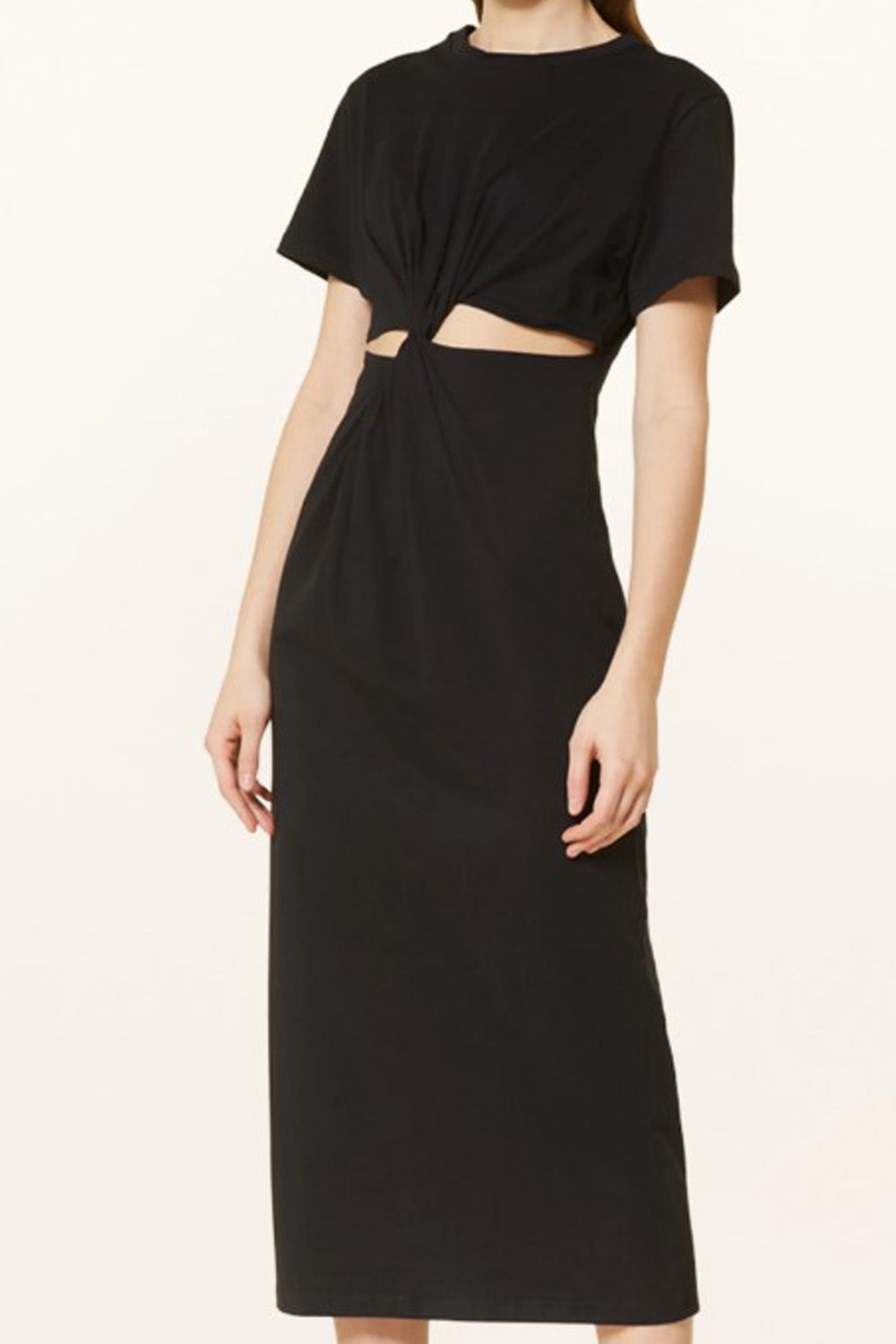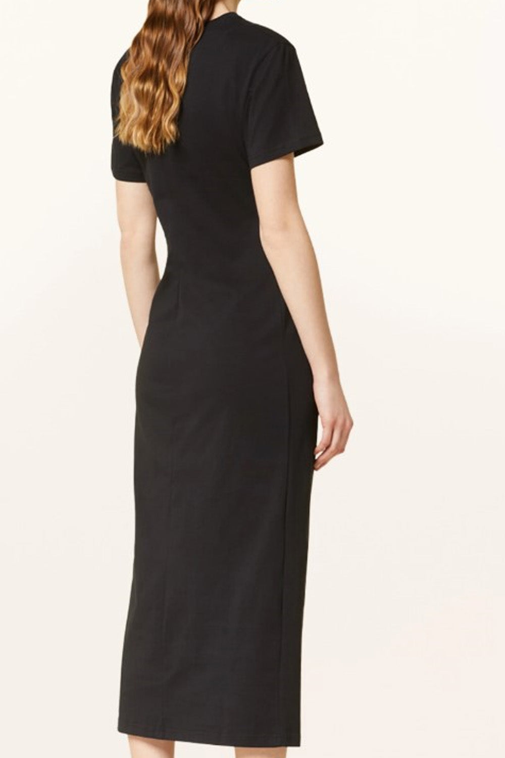 Type-Elemental Black Dress, Color-Black, Neck type-Crew neck, Sleeve Length-Half Sleeve, Fit-Regular, Fabric-Poly Lycra