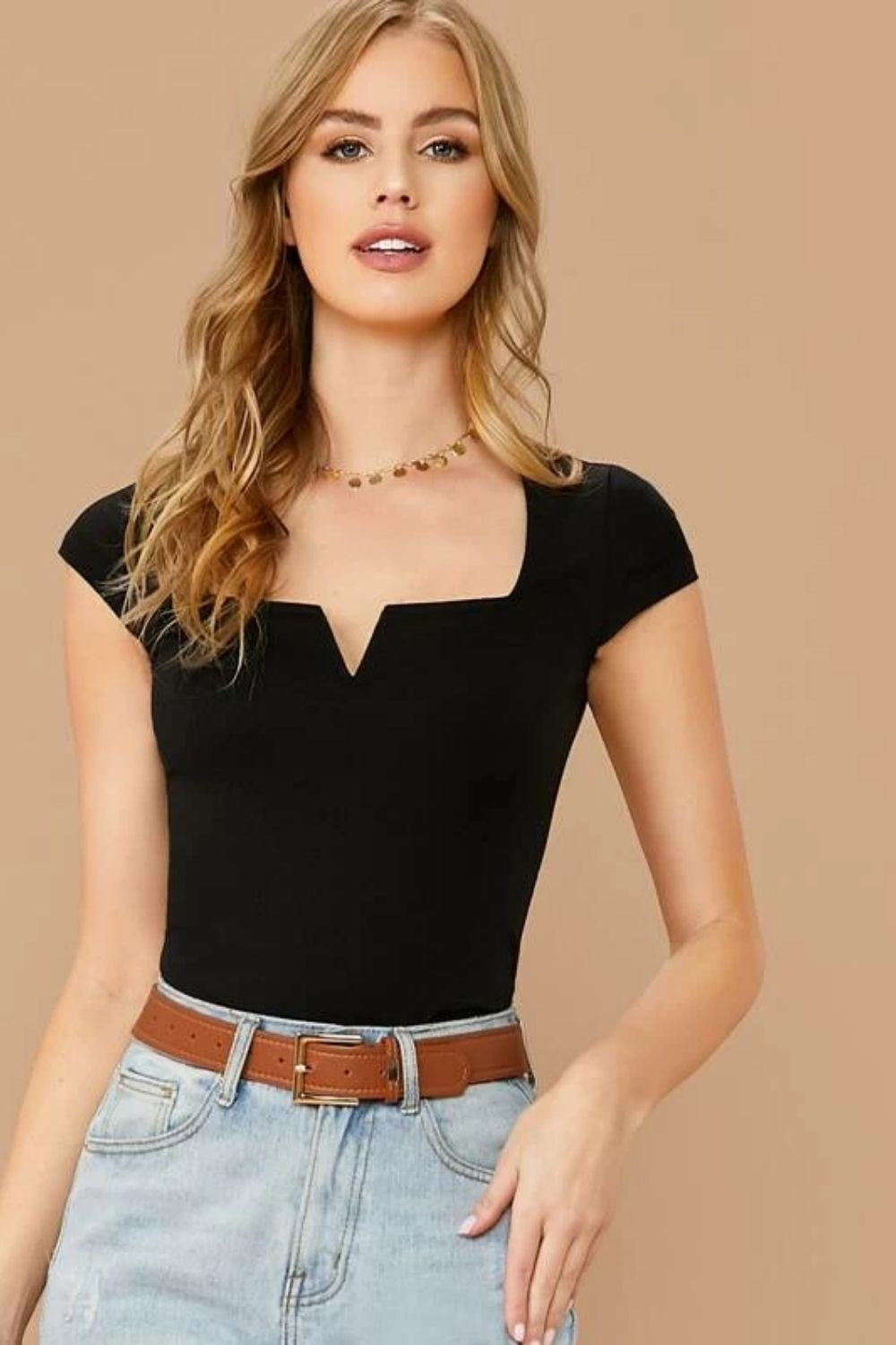 Description: The Elle Black Top is a fashion-forward piece that effortlessly combines classic elegance with contemporary style. The square neckline adds a touch of uniqueness, framing your collarbone and creating a flattering silhouette. The short sleeves provide a breezy feel, making it the perfect choice for warm summer days.