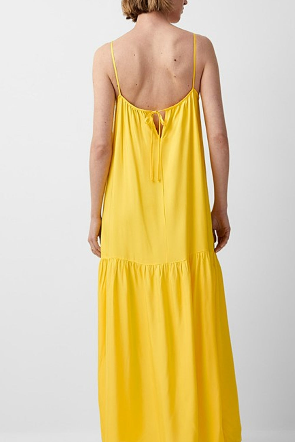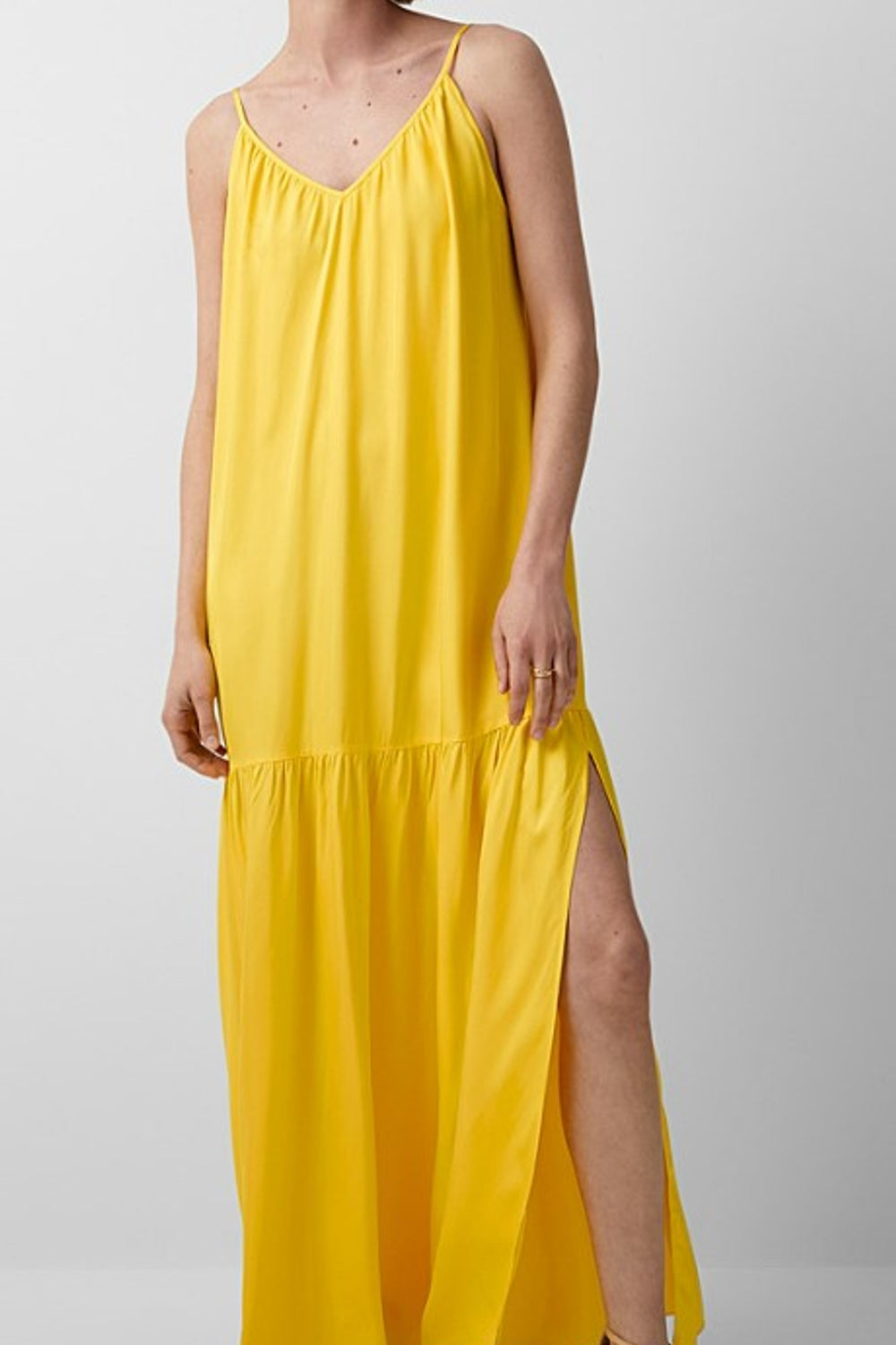 Type-Enchanting Yellow Dress, Color-Yellow, Neck type-V Neckline, Sleeve Length-Sleeveless, Fit-Relaxed, Fabric-Rayon